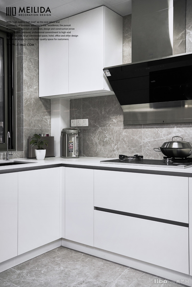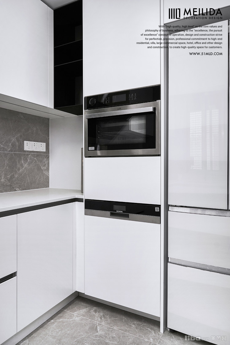 洁白的橱柜和大理石的墙地面相呼应,