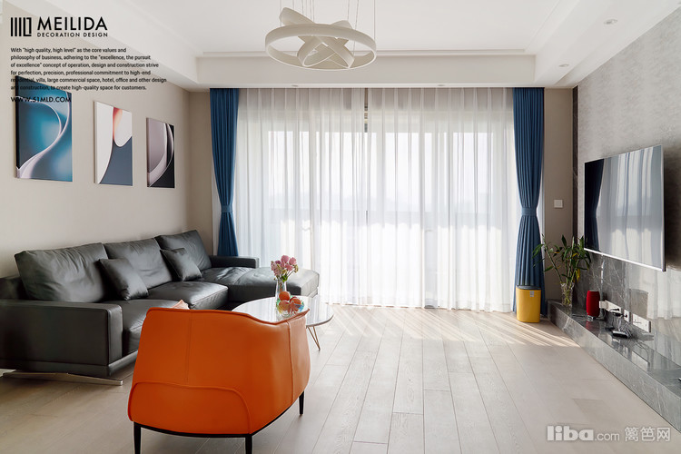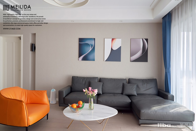 ▲深灰色的沙发简约而又不失单调,上方三幅挂画营造了一个低奢有调性的氛围。橙色的沙发让整个空间增添的明亮的感觉。