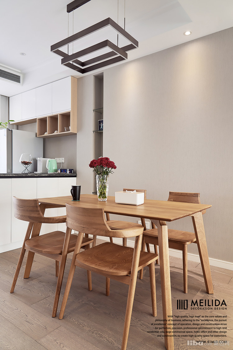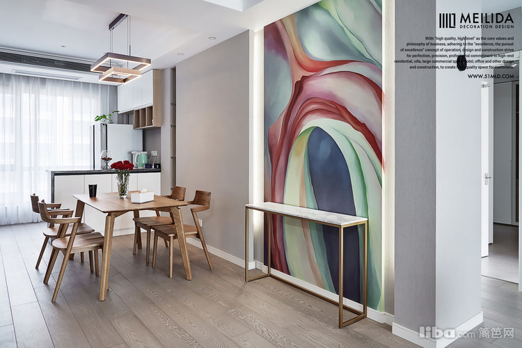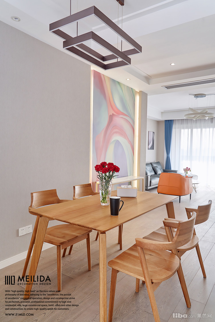 ▲原木色让餐厅显得轻松又自在,看起来使得空间很有整体感。丰富多彩的背景墙更能够体现出室内空间的层次性。