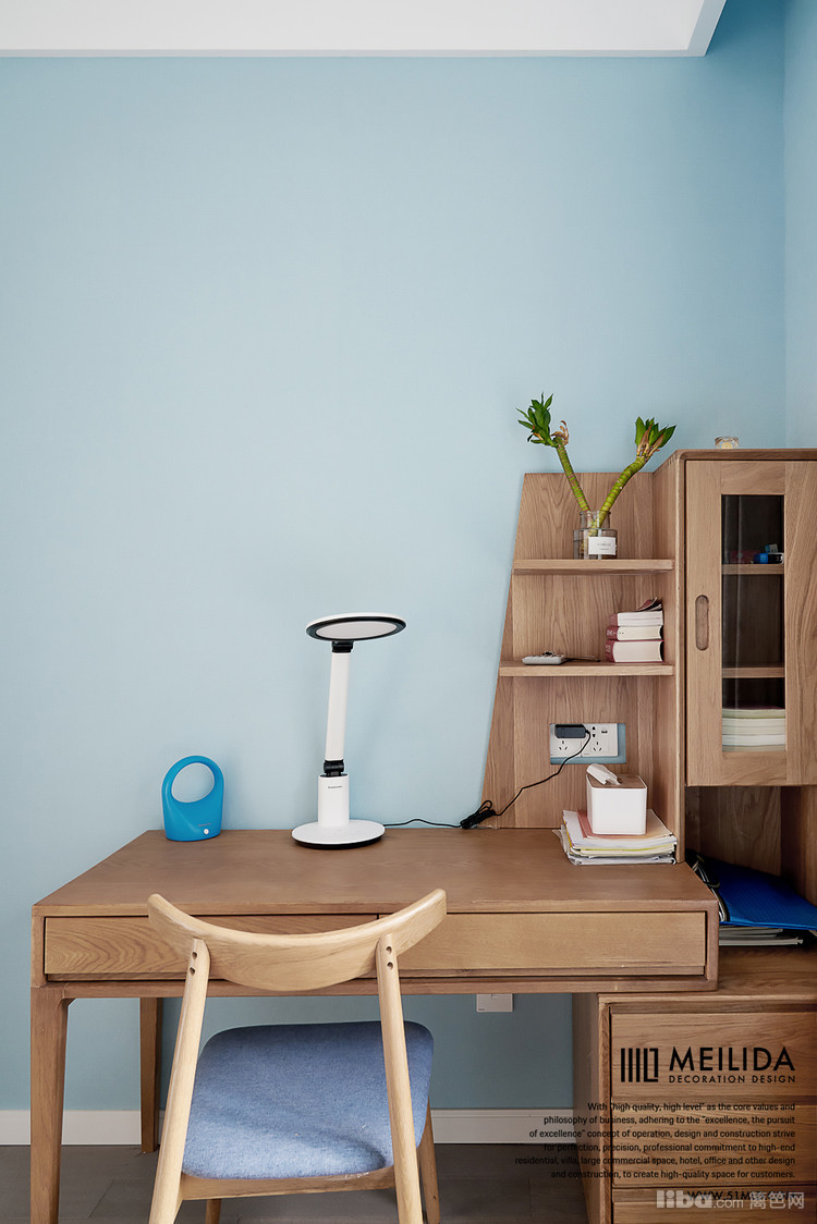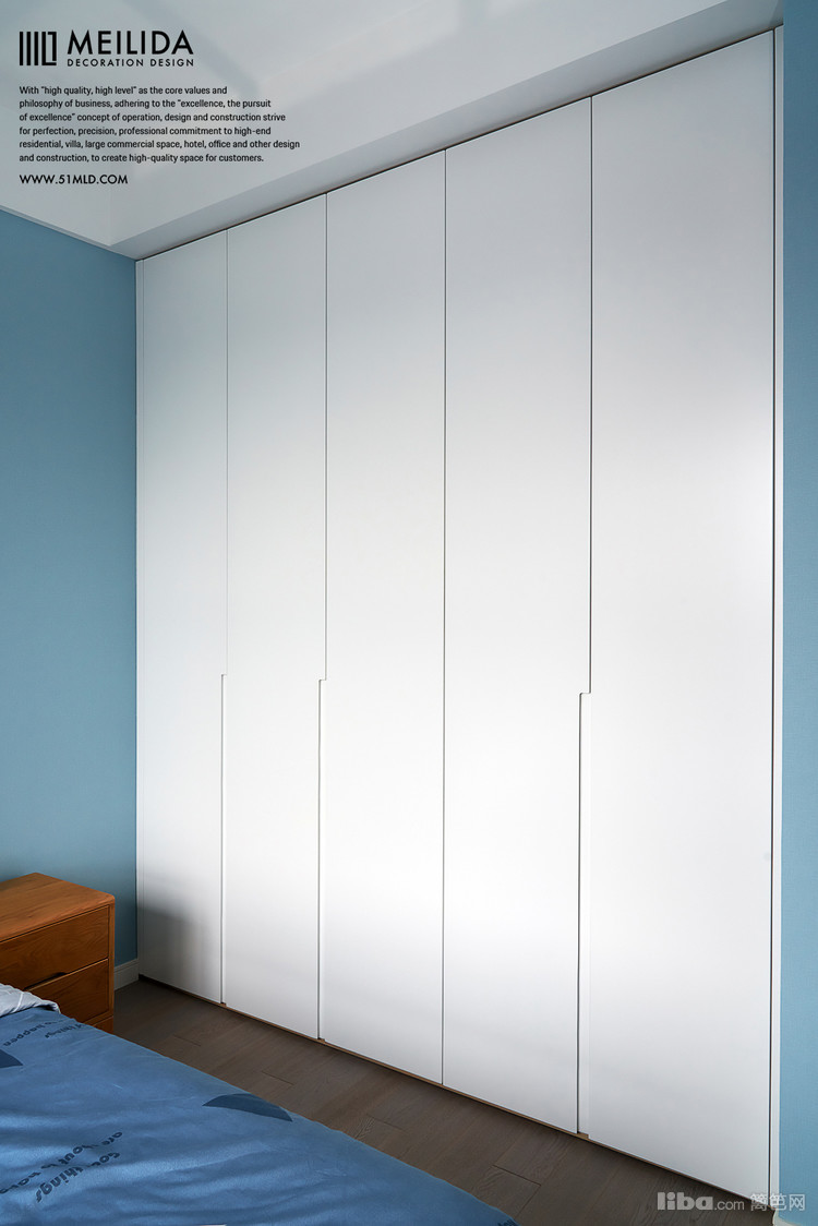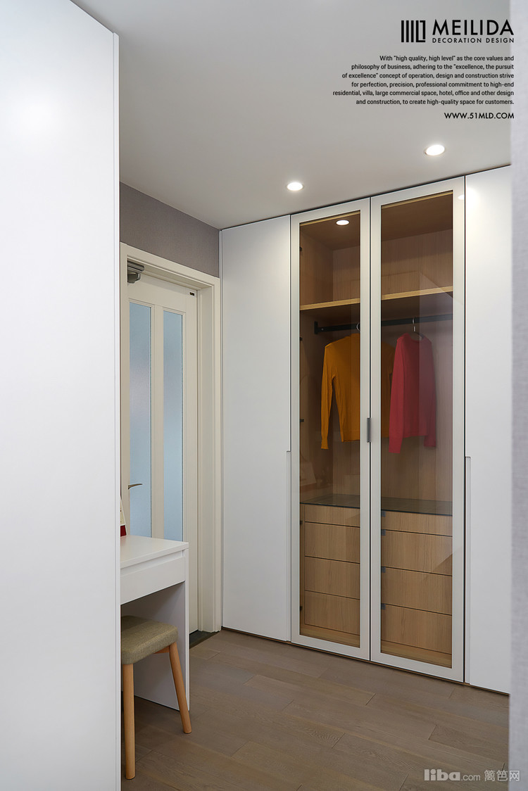 ▲主卧以灰色蓝色为基调,营造出一种优雅、宁静的氛围。墙面的衣柜设计和梳妆台也充分的满足了屋主的需求。