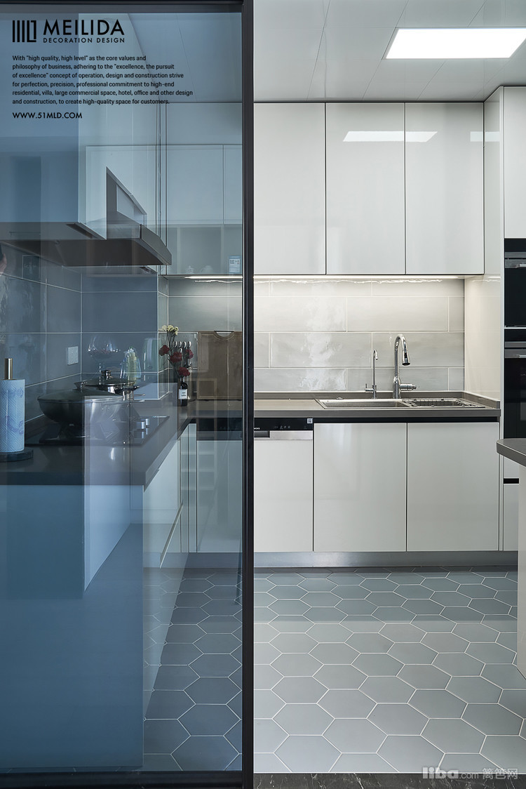 ▲厨房的地面选择了多边形砖的组合,让整个空间更加的有层次感,搭配蓝色的玻璃门和白色的橱柜,整体干净而又清爽。