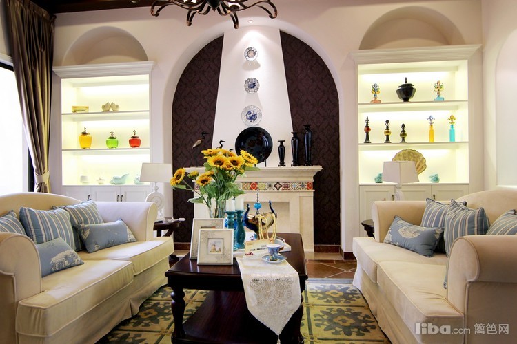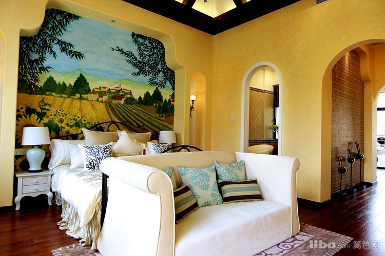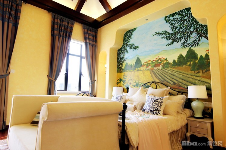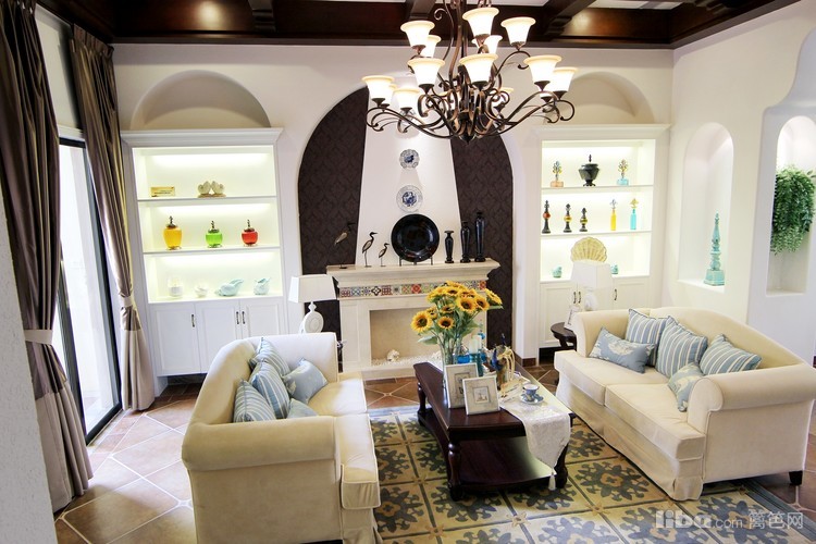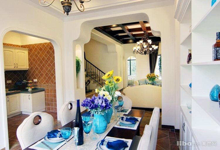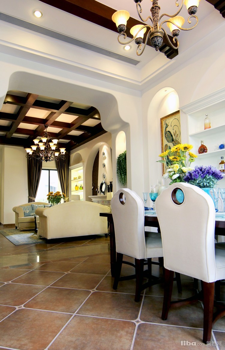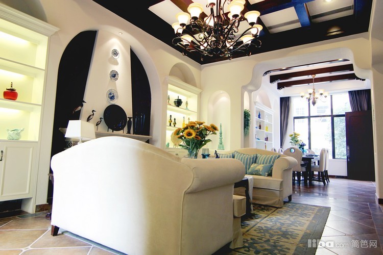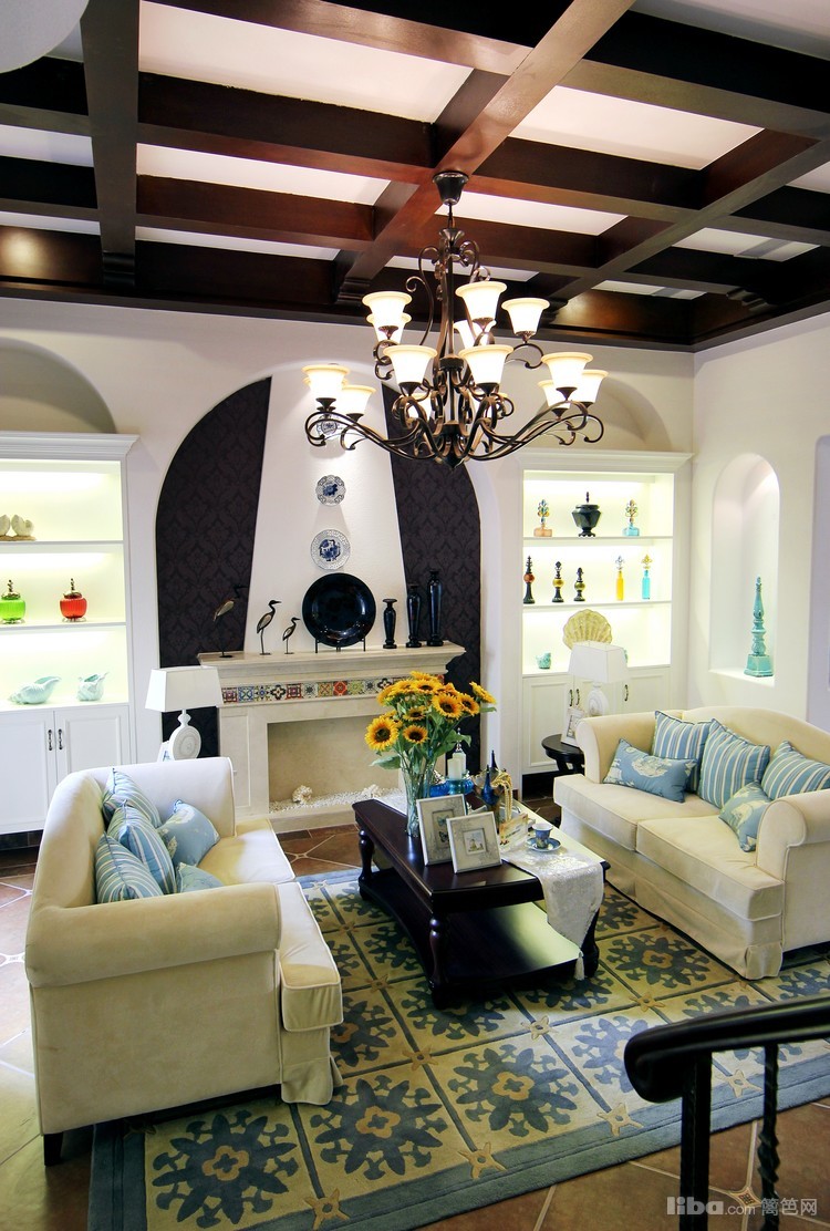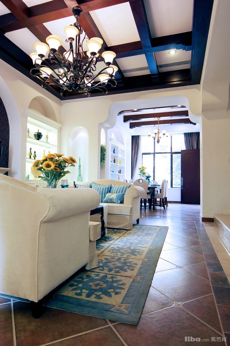 复原木制吊顶,给整体增加了很多田园的氛围,搭配以铁艺复古吊灯,更彰显了田园的格调