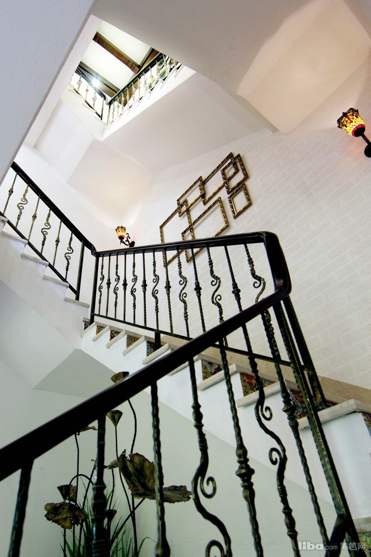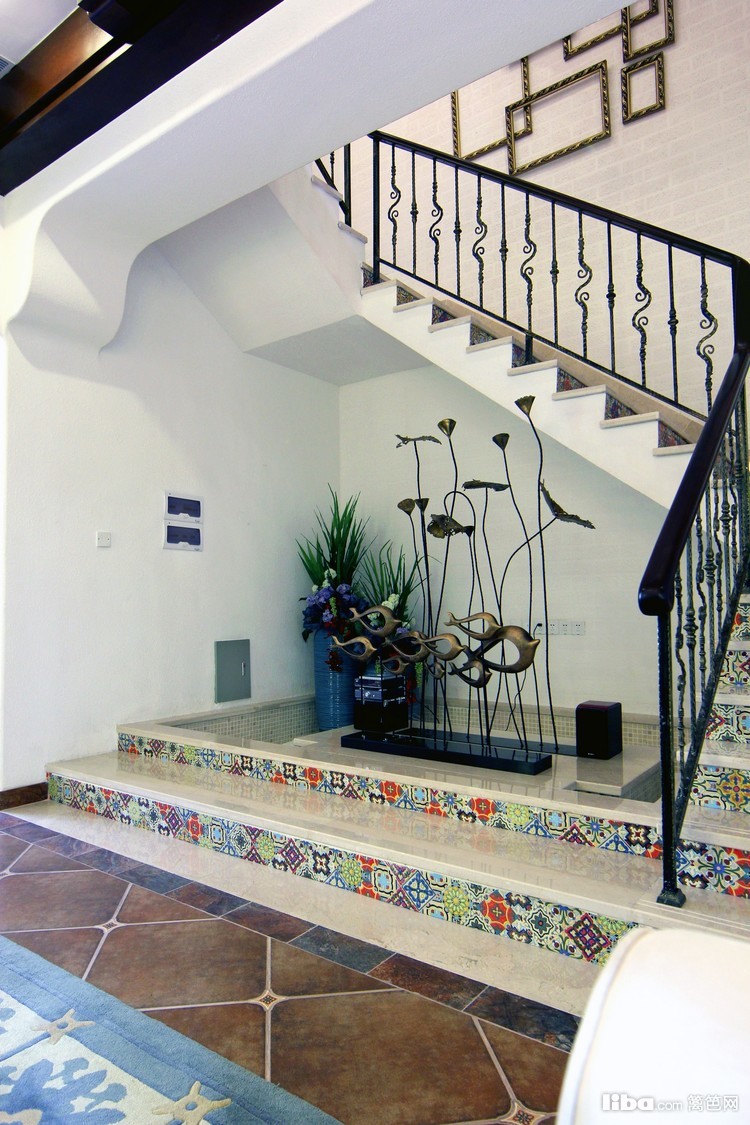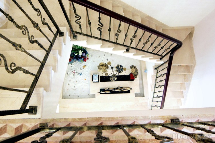 铁艺楼梯扶手搭配大理石楼梯踏步板,中间的部分做拼花砖的设计。楼梯就不再是那么单调了