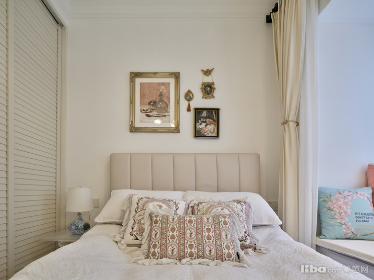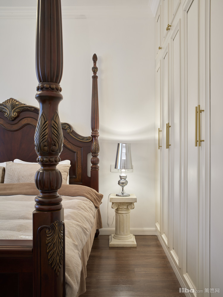 主卧墙面用奶昔白为主色调,加上优雅的法式线条 ,整体平衡了深色原木床带来浓重的氛围感