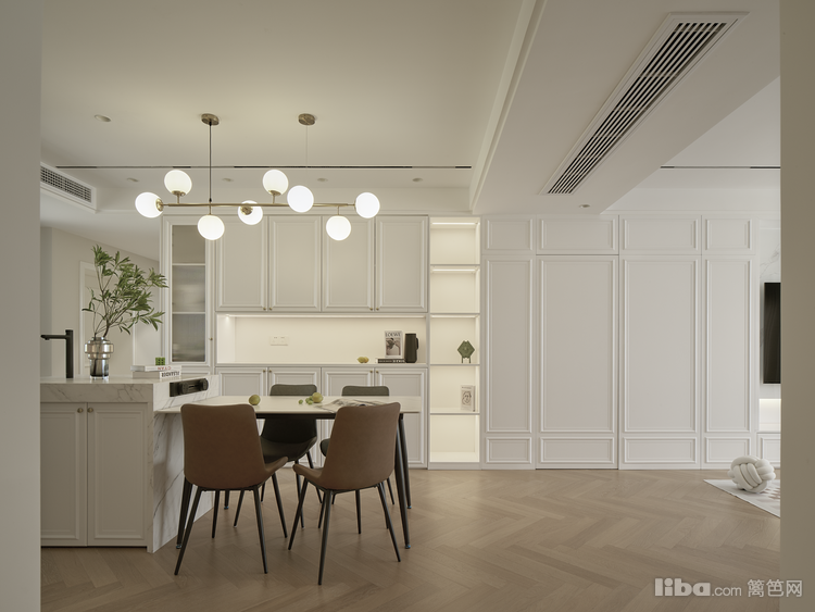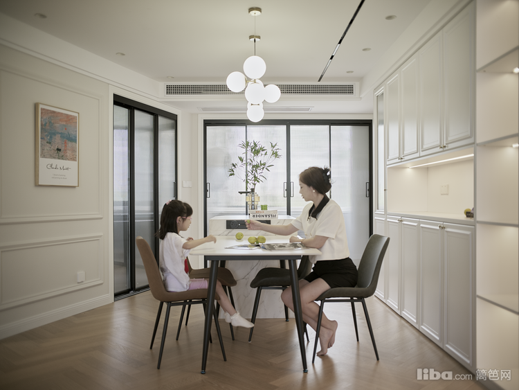 岛台设计平常可以满足业主西厨爱好,做做烘焙和无烟烹饪。加设的岛台等于提升餐厅区域可使用面积,无论是一家团聚还是朋友做客都十分方便