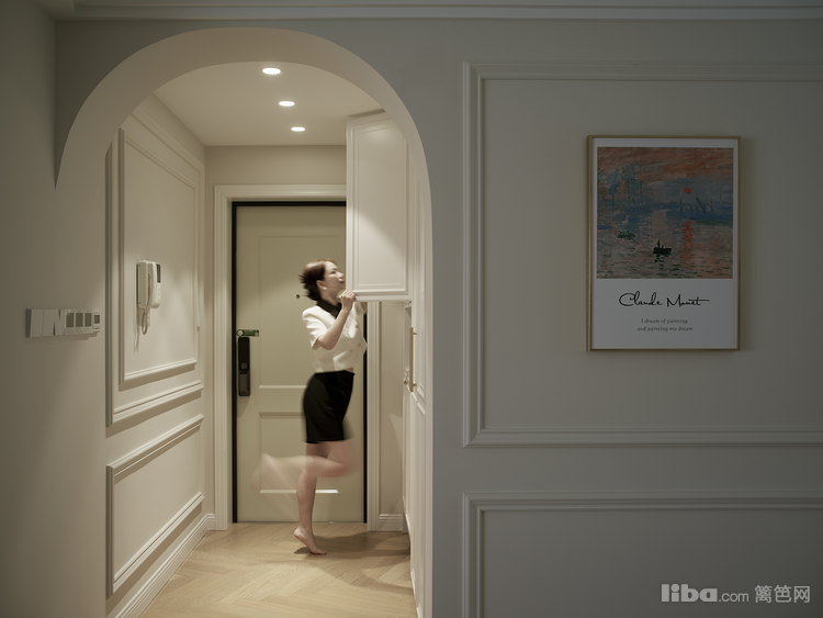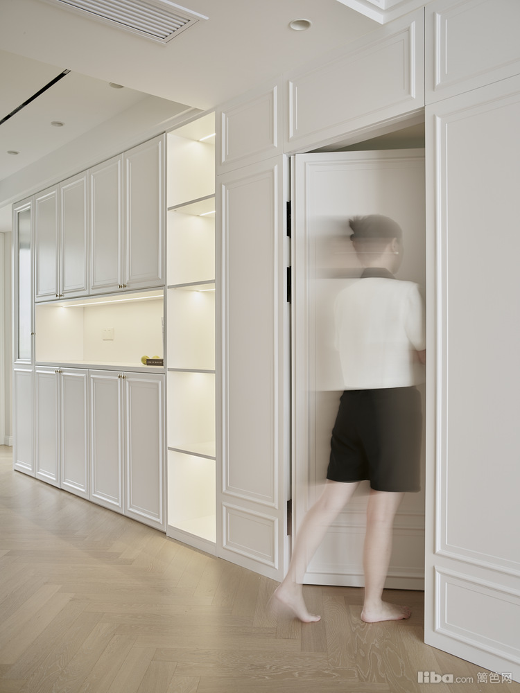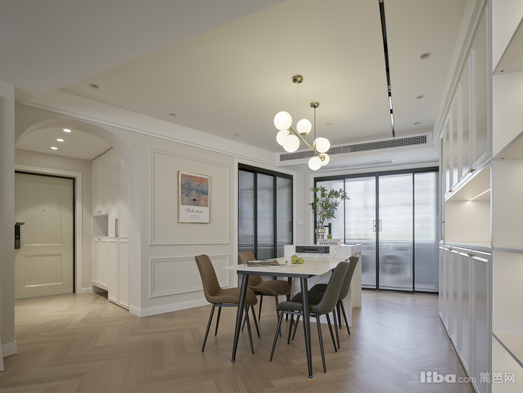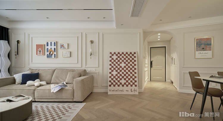 玄关处拱形门洞的设计点亮区域空间,也加浓整体法式氛围感。从玄关开始地面是人字拼木地板通铺,木材天然肌理进入空间即刻便会感受到满满质感。