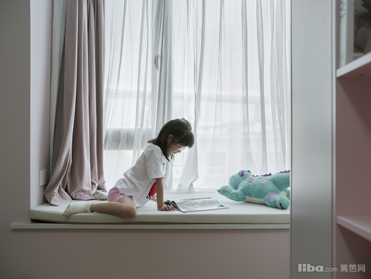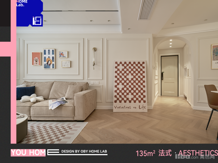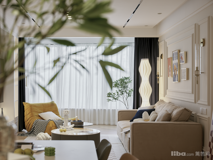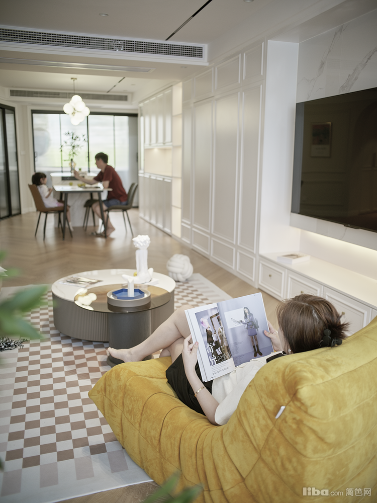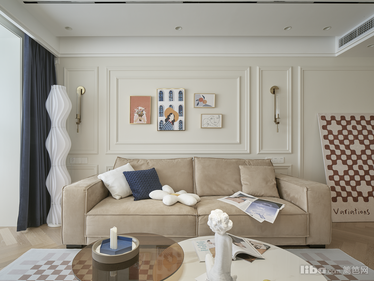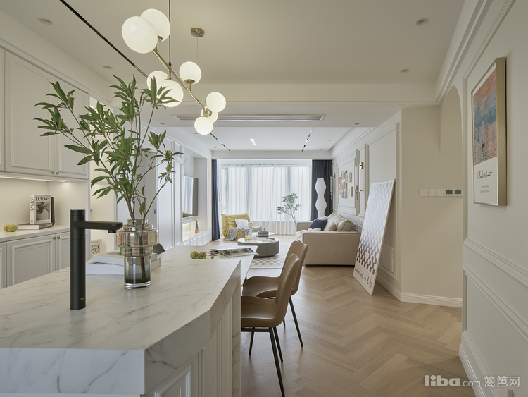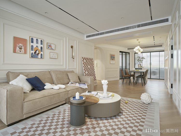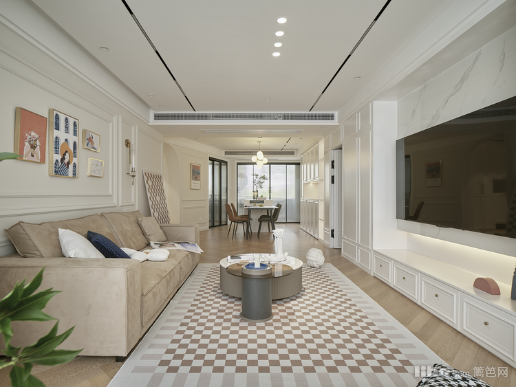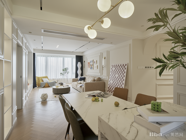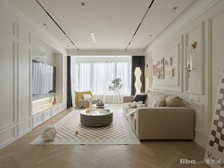 通透感客厅,无主灯的设计元素 现代和法式的结合 |客厅与阳台之间采用连通方式,隐形门的的设计加入线条的端景柜凸显了设计风格,开放的空间减少了隔断阻碍,可以方便全家互动与交流。