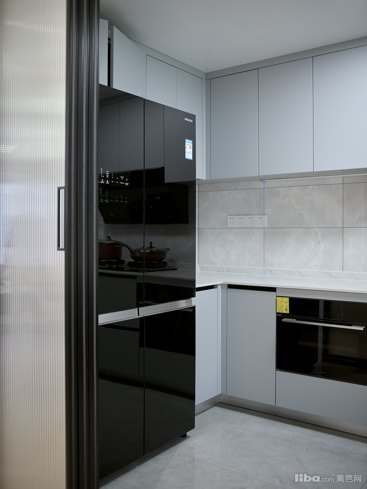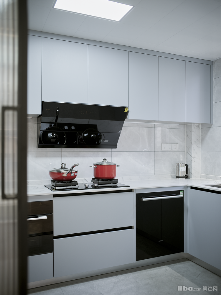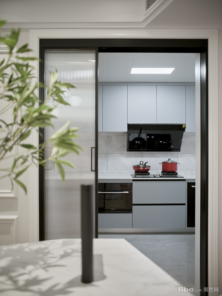 中厨+灰色橱柜,法式风格中加入一些现代感,整体风格不单调。厨房浅色系为对应主体风格做了调和,浅色扣板搭配灯光厨房显的更亮堂,给厨房增加了流畅、简洁的视觉效果