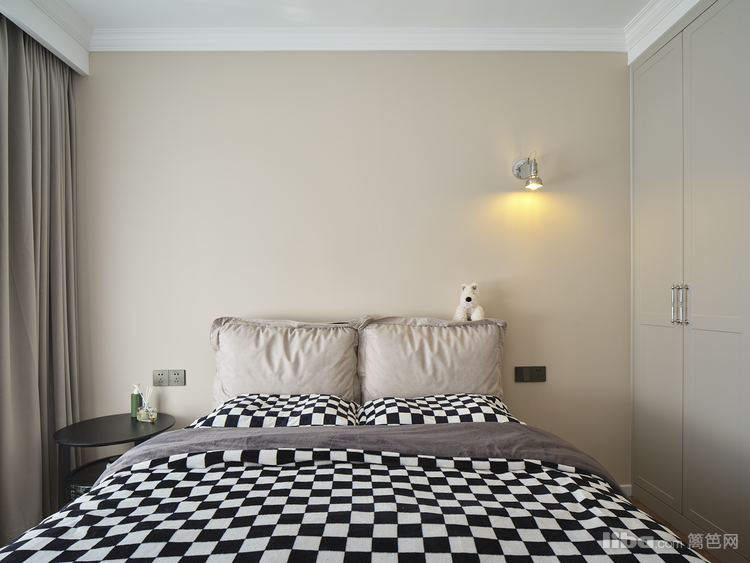 卧室是居住人最柔软的区域。进入主卧空间,整体布色以暖色调为主。鹅黄的床饰搭配焦糖色的床体,由浅及色,舒适自然。床边巨型的小熊玩偶,提高了区域空间内的意趣,使得空间多了几分活泼