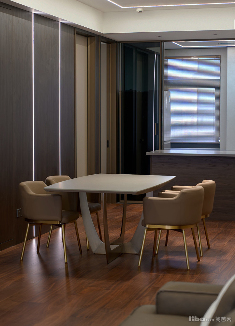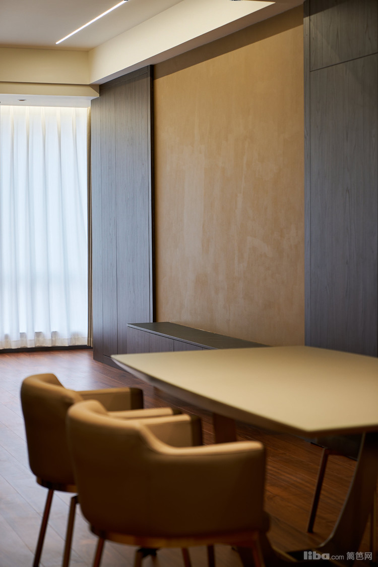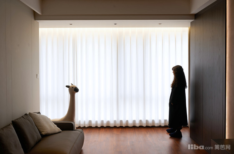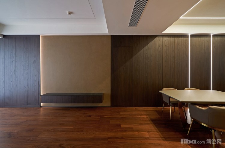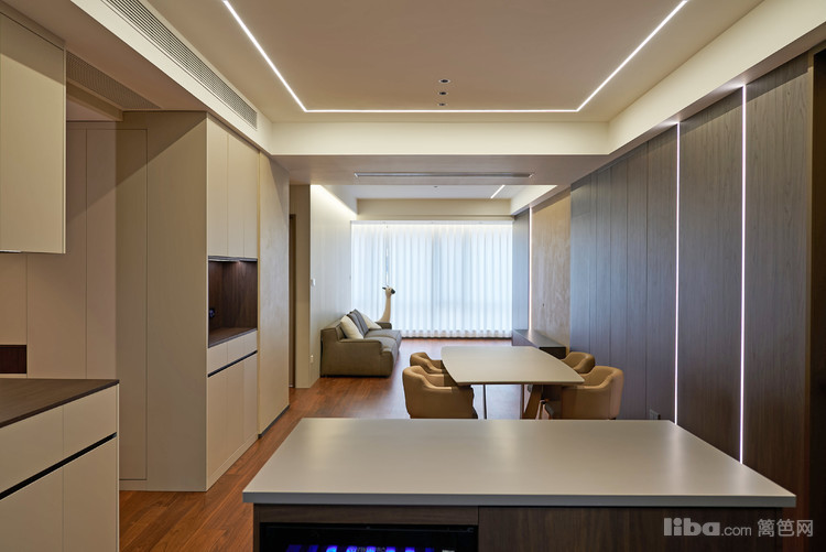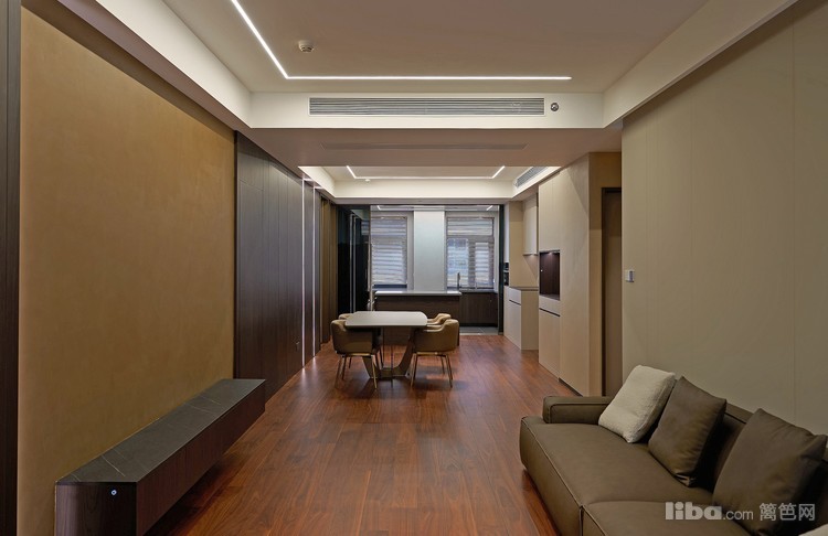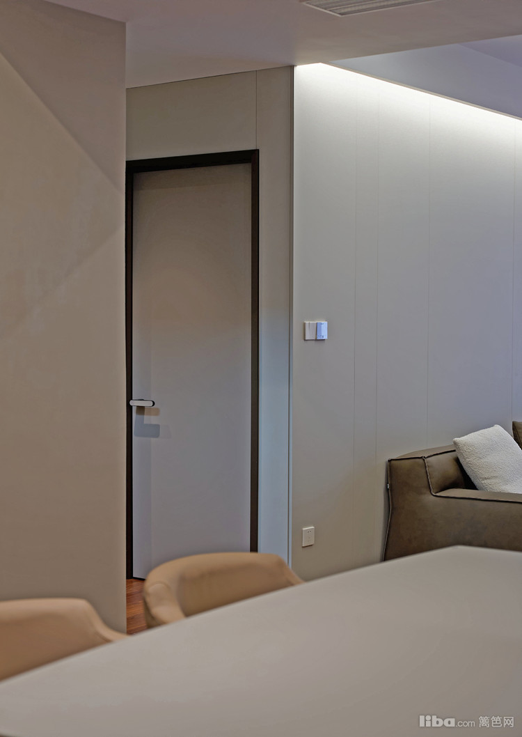 客厅空间光感与视觉;规划动线格局,突出动区光与美。客厅采用无主灯设计,线性灯带走圈+嵌入式防眩光筒灯为客厅主光源和点光源分布