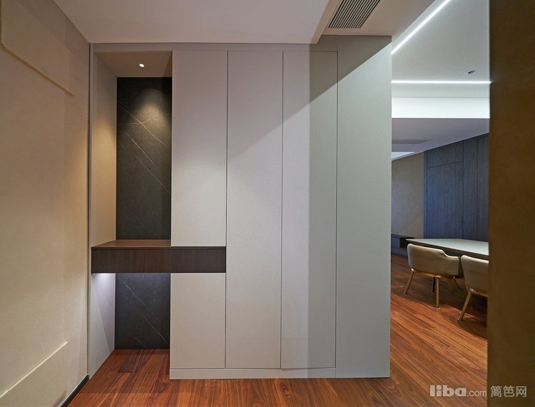 进门玄关端景,可以有效阻挡视线,保证私密性。鞋柜跟餐边柜连通,中间镂空,有效延伸玄关的视觉空间效果