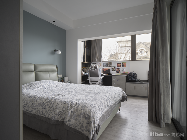 卧室的整体配色以大象灰+米白色搭配,低调中透露出轻奢质感。