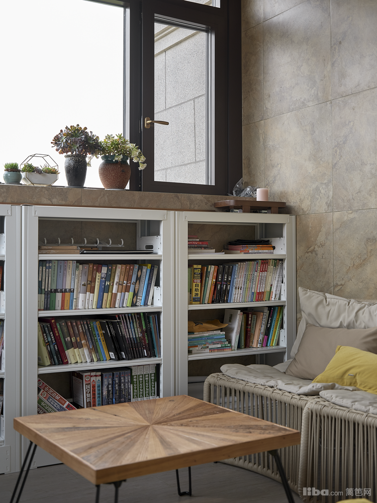 改造后将原来露台封顶作为一个休息区+书吧设计,一屋两用提高空间的使用率