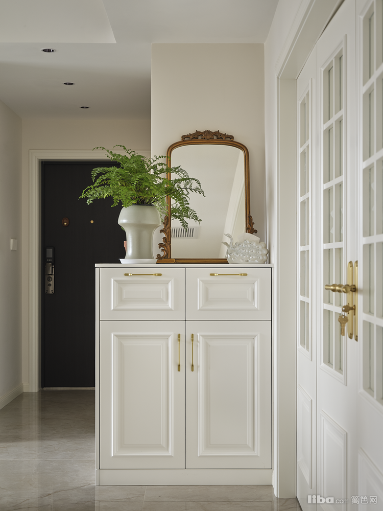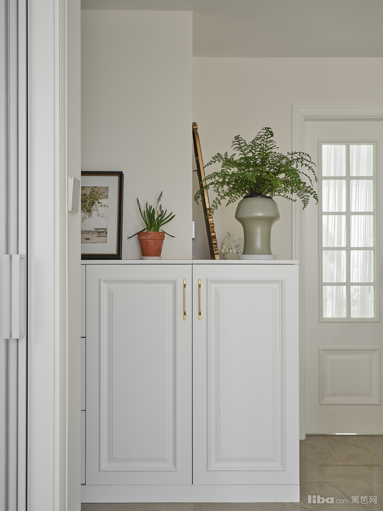 入户玄关空间利用多余的面积来做了一组L型转角半柜,来负担掉入户区域的收纳,同时也置放些摆件和绿植到装饰空间作用