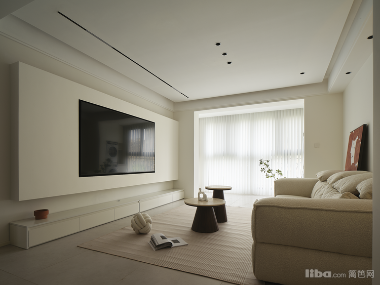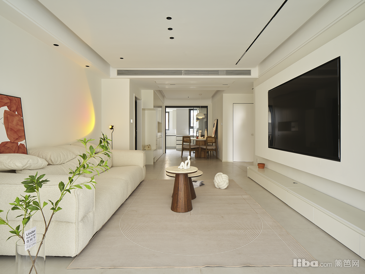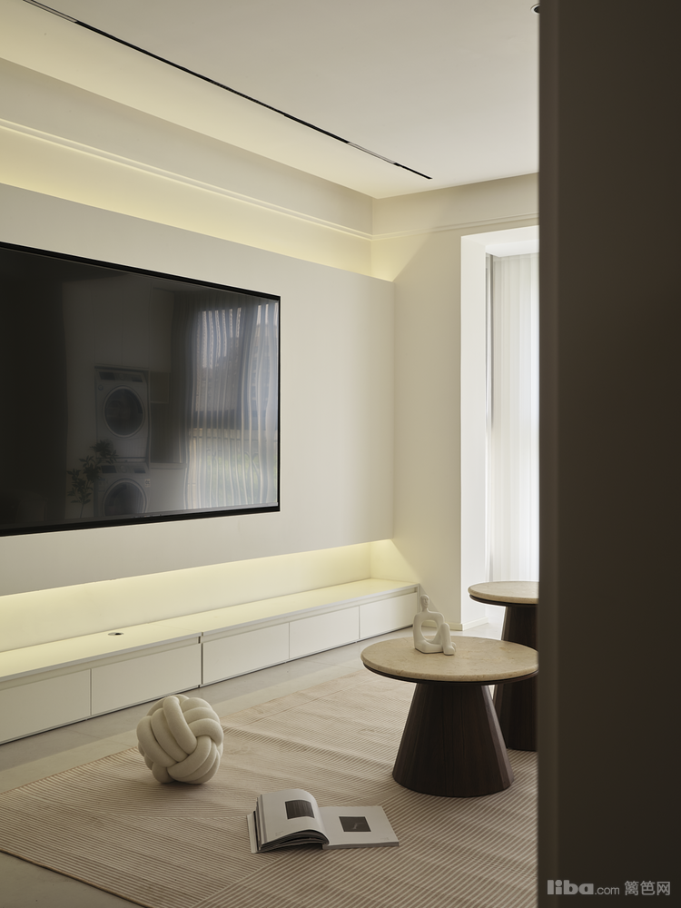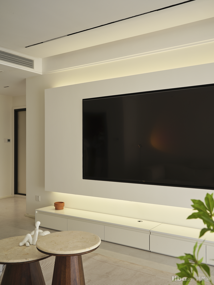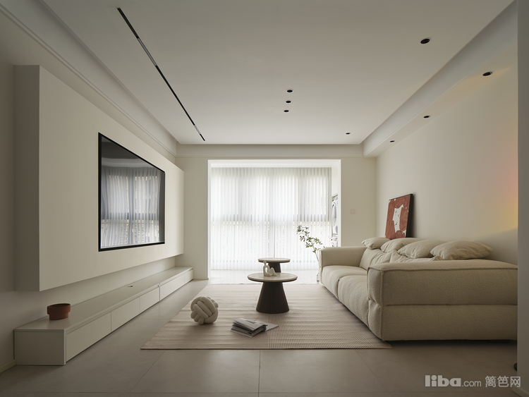 客厅面积23.7平、局部尺寸:电视背景长4.5米,沙发背景墙长4.2米,客厅宽3.9米:悬浮吊顶+无主灯的设计,增添视觉层次变化,客厅阳台打通,通铺地砖使空间纵深比例加剧