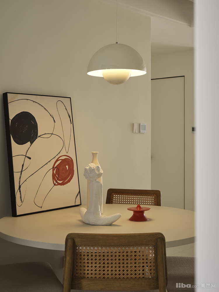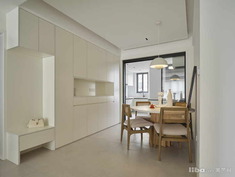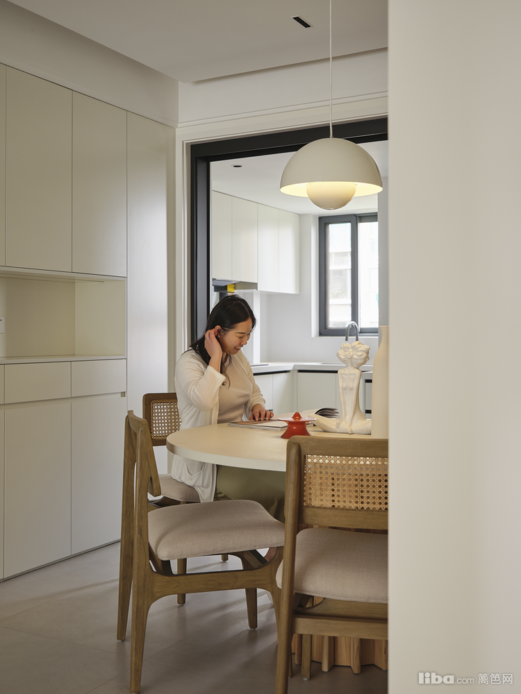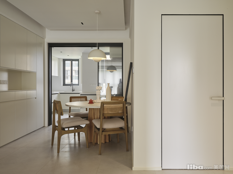 餐厅总面积10㎡,客餐厅无隔断,为的是拉长家居动线的视觉比例。餐厅紧邻厨房,为了保证餐厅两边引入光源,厨房采用极窄黑框玻璃移门;空间通透感有了保障。