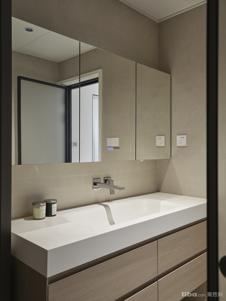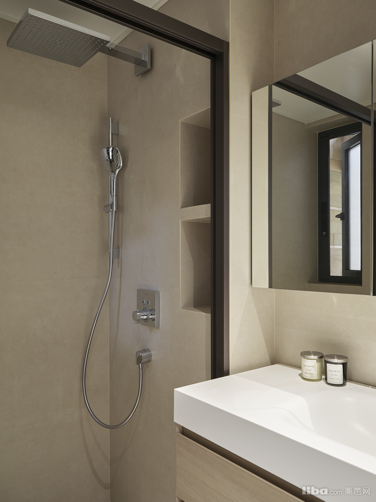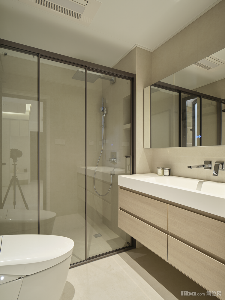 生间面积4.2平、长2.4宽1.8;水台盆墙排水,花洒暗装,隐藏式设计增加空间纯净度