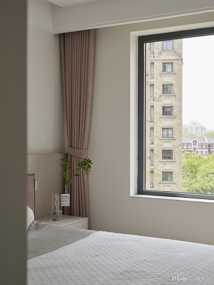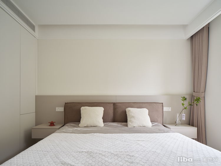 进入卧室空间色调以灰白为基底,辅以莫兰迪哑红为色彩辅助。符合业主喜欢的调调,简单又时髦。