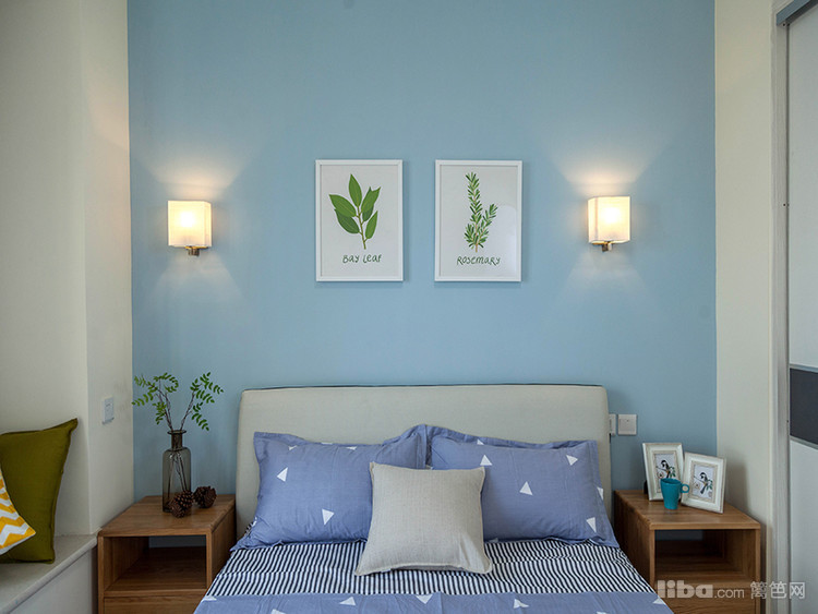 用天蓝色的涂料,简单修饰了床头背景