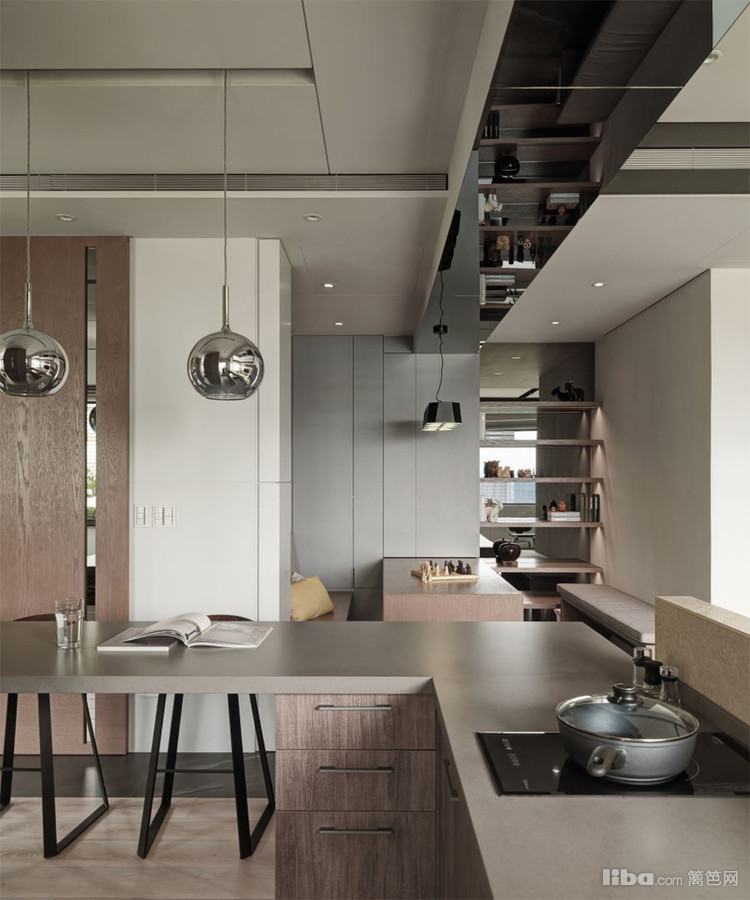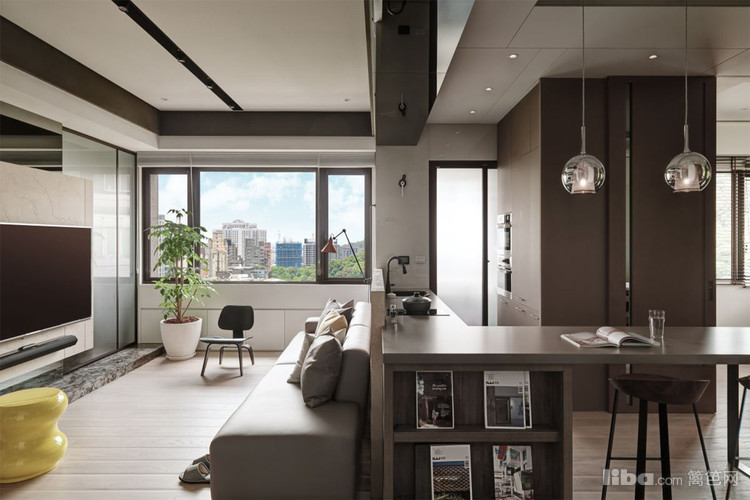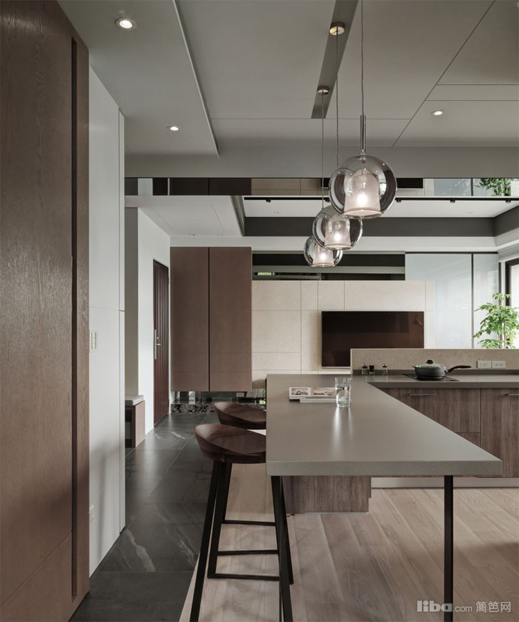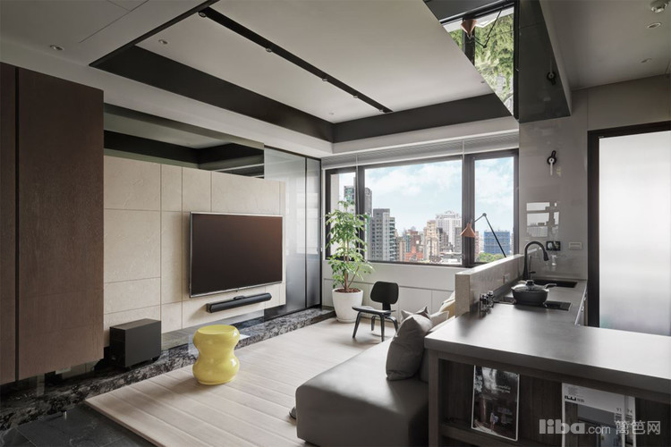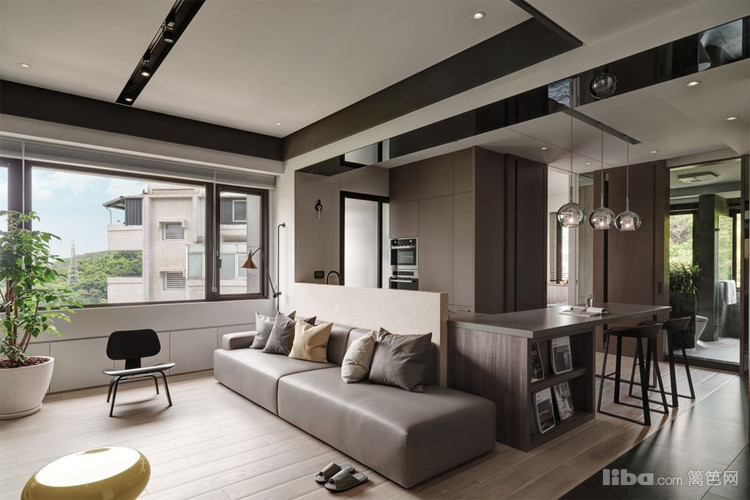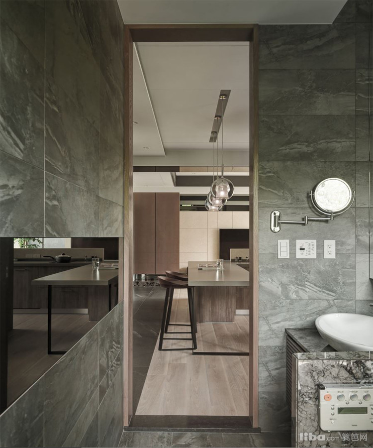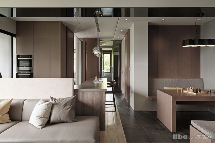 把茶色玻璃运用在墙面贺顶面,凸显出现代简约