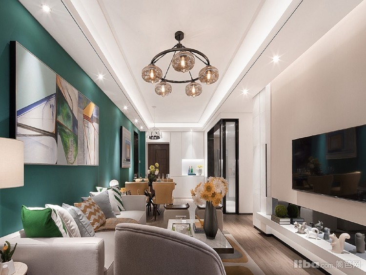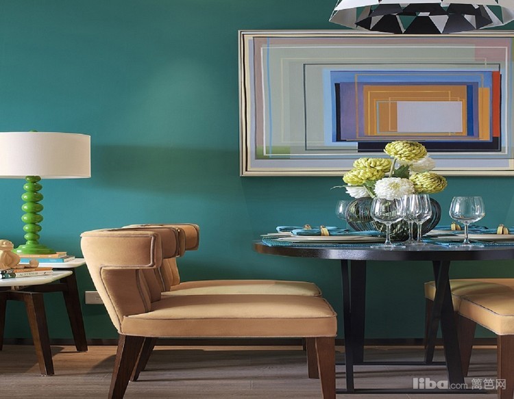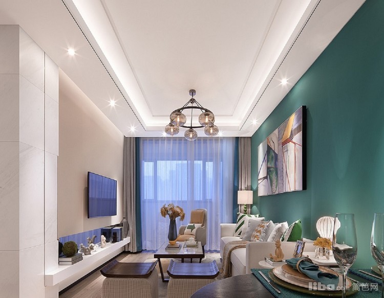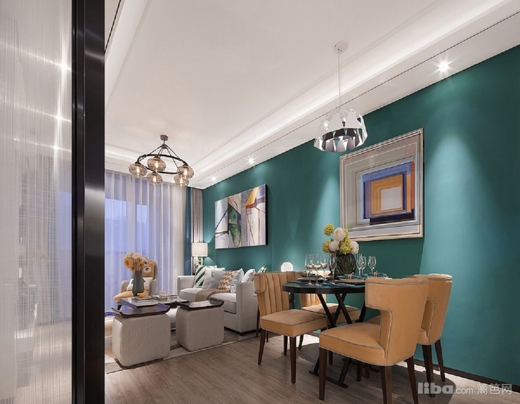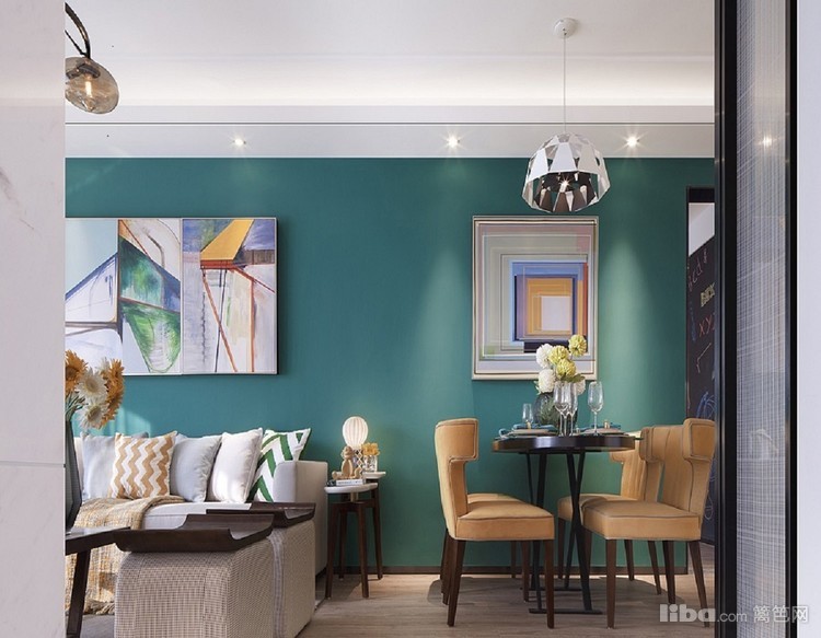 用湖蓝色做成大面积的装饰墙面,连同客厅餐厅。