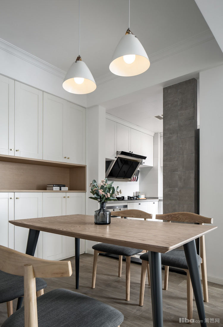木色与灰色的点缀,让用餐区变得时尚、精致、简洁,半开放式厨房开阔空间,美观实用,实现了空间的通透性和情感交流。