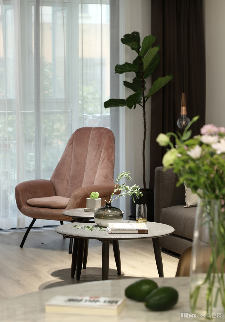 植物的绿、吊灯的金属色泽、单人沙发的烟粉,点缀其间装饰出恰如其分的生机和浪漫。