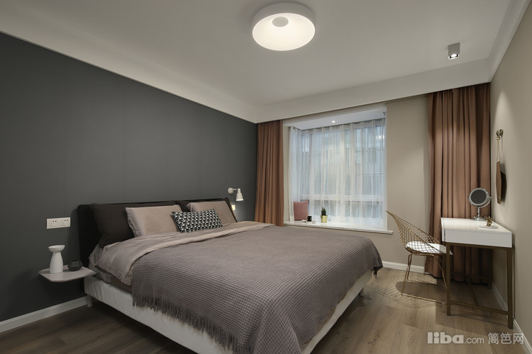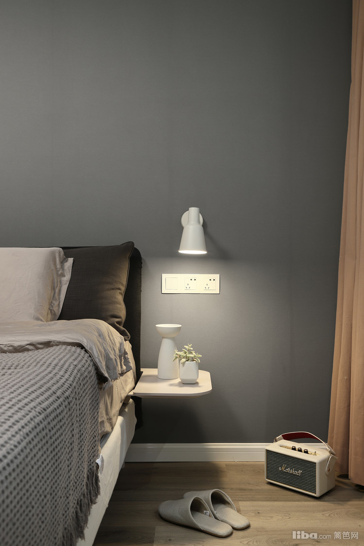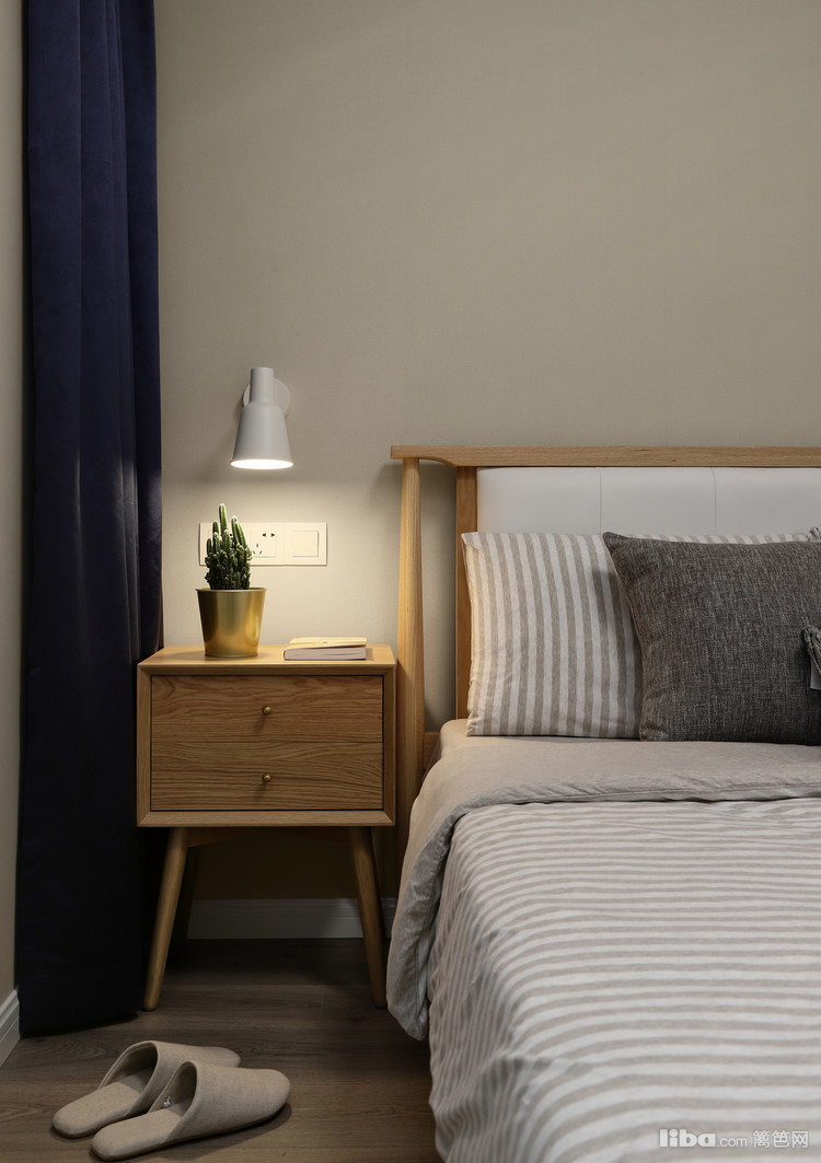 卧室,床品都选用了全棉的材质,亲肤舒适,搭配原木色地板、床头柜凸显自然,搭配深蓝色窗帘则凸显安静,床头灯选用了简洁的款式,一打开,温馨气氛瞬间袭来。