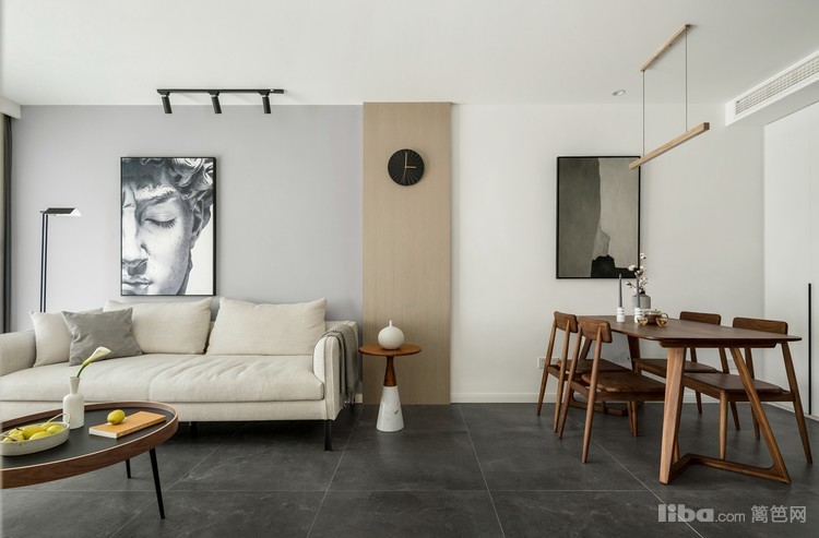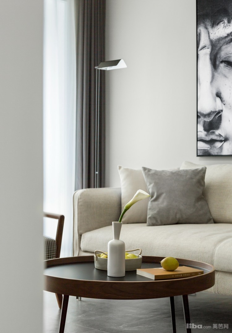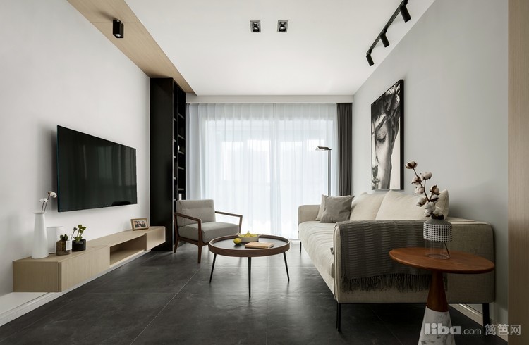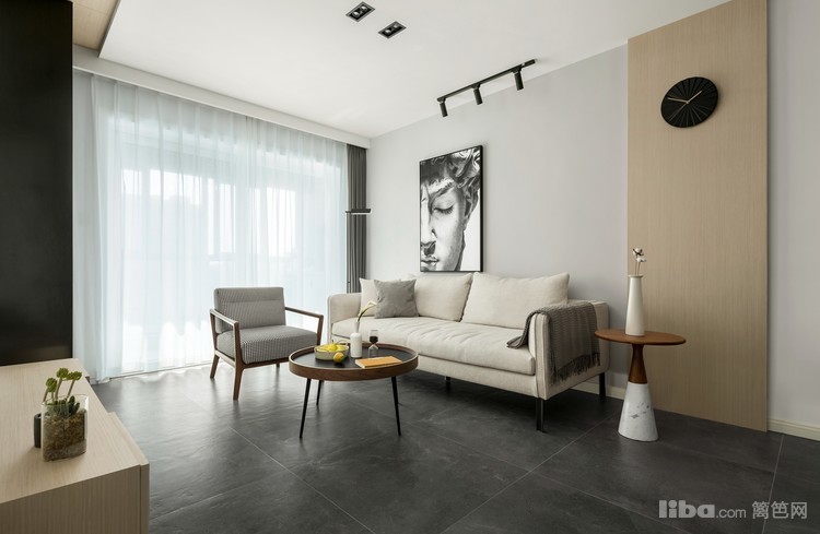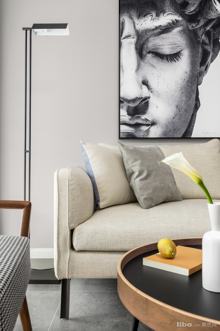 客厅吊顶拉平,无主灯,光源用落地灯、射灯、筒灯结合,局部分散照明可以让空间更有层次感。