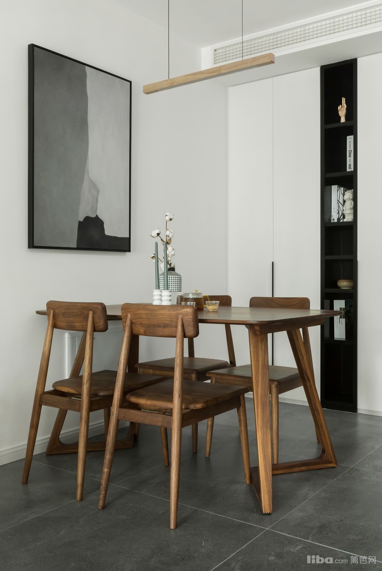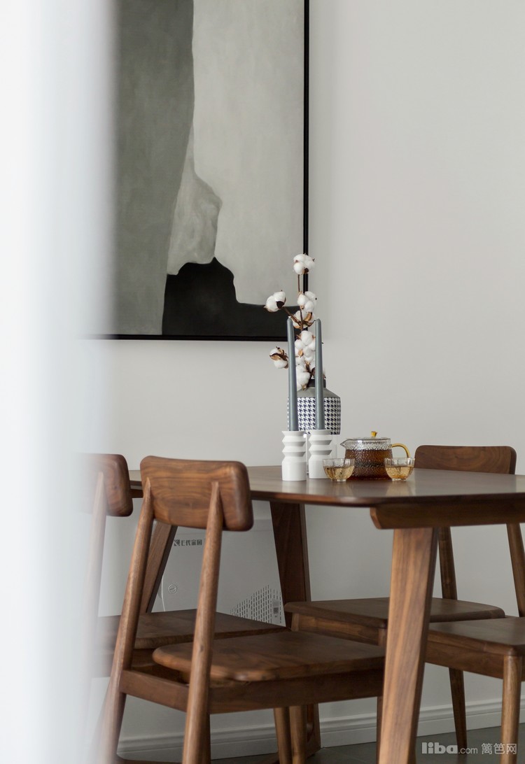 餐厅侧边墙设计了一排柜体,藏和显结合,白和黑有对比。餐桌上配置自带格调的小物件,瞬间提升幸福感。
