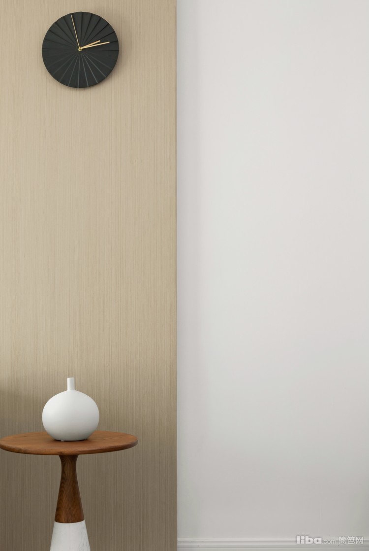 地面深色调,整个墙面空间都是大面积留白,局部搭配木饰面,想要表达的效果是稳、空、质。