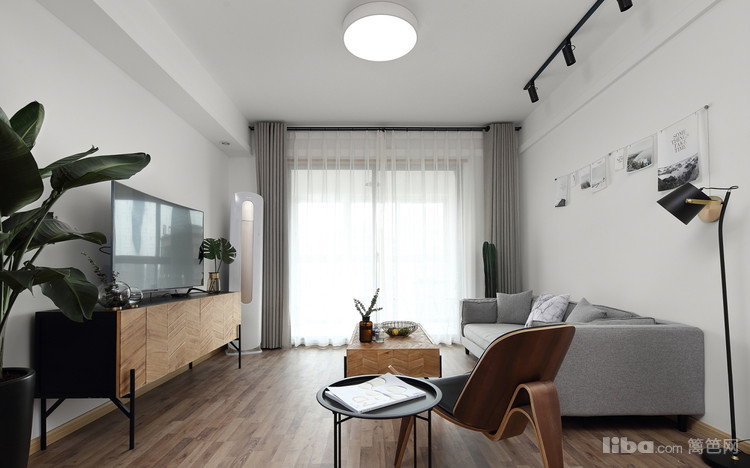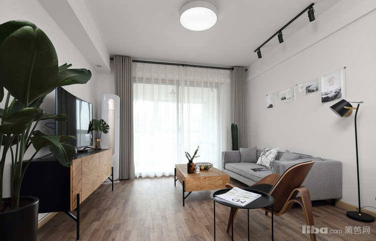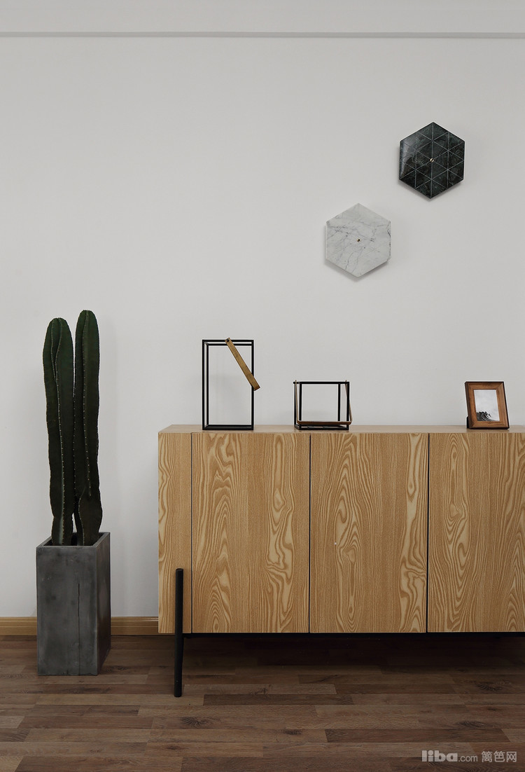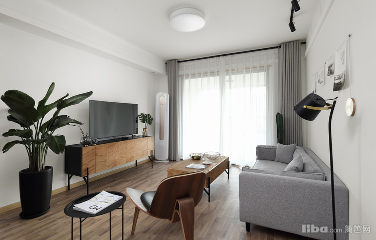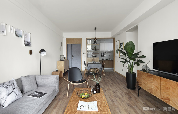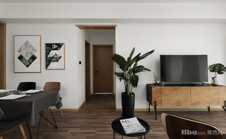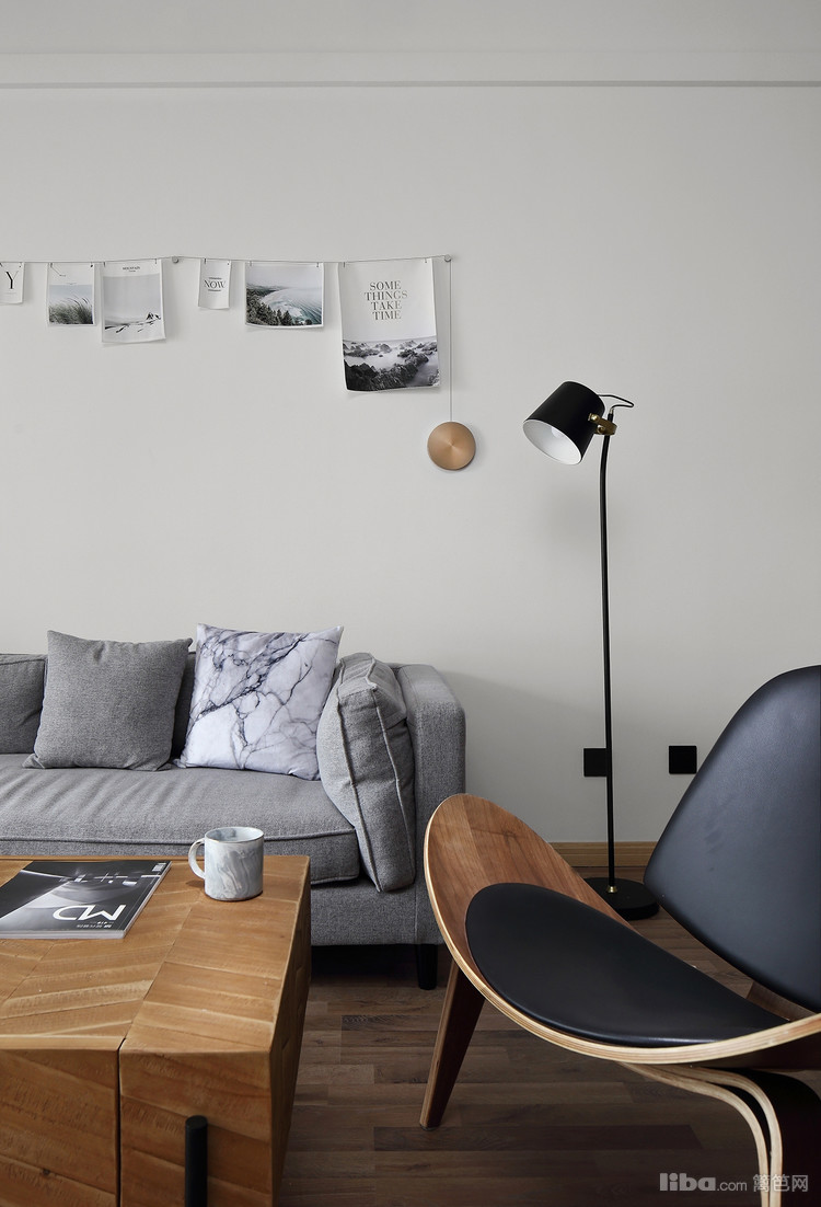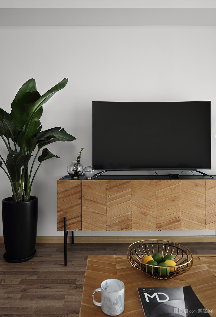 客厅区域摒弃繁杂的硬装造型,只用简单的木色、纯色及留白,更显随性。