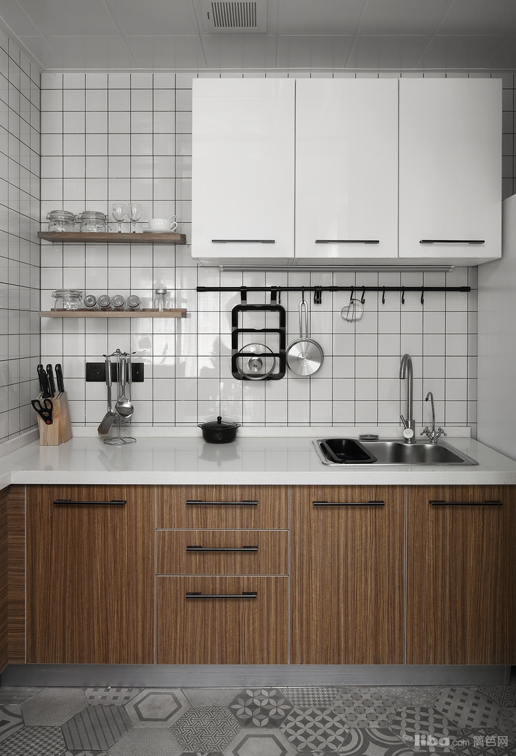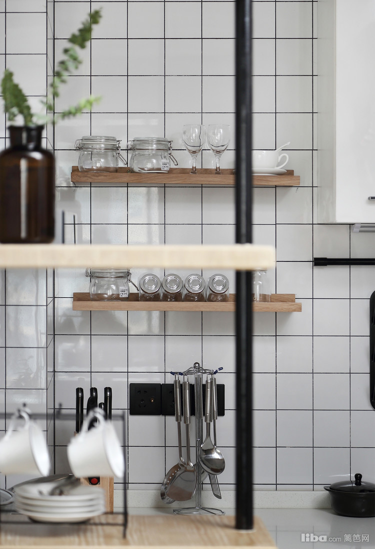 厨房区域利用隔板及壁挂架来增加放置空间,选用好看的储藏罐及厨具装点厨房,简约而不简单。