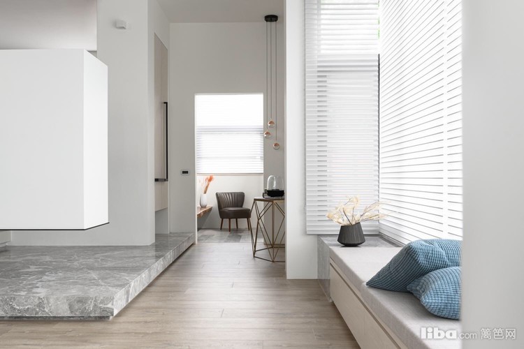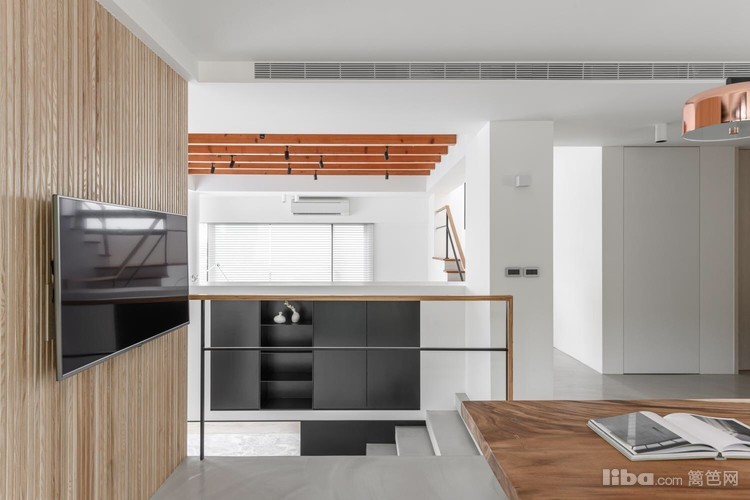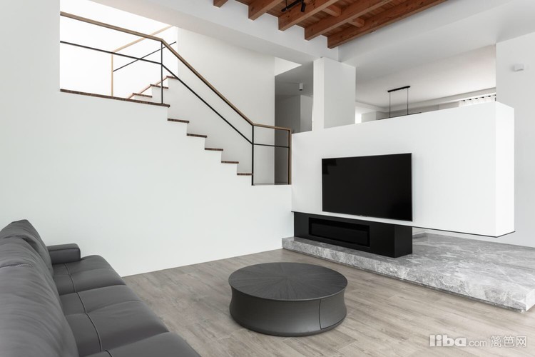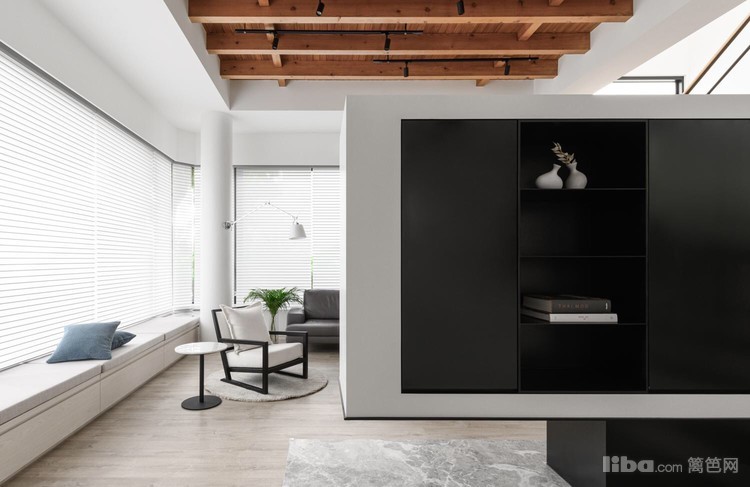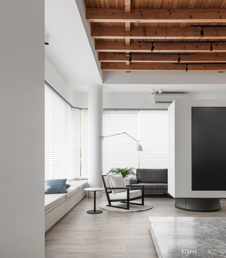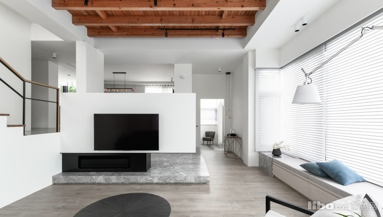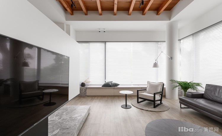 再加上灰调木地板呼应天花板上的实木横梁,为整个洁白空间增加了不少暖意。