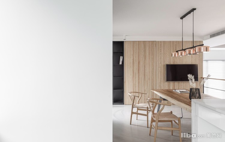 餐厅空间,原木餐桌+中式餐椅+不占地的条凳,和中岛下方以及一边顶天立地储物柜的格栅,组合在一起,那依然是自然的味道,格外和谐。