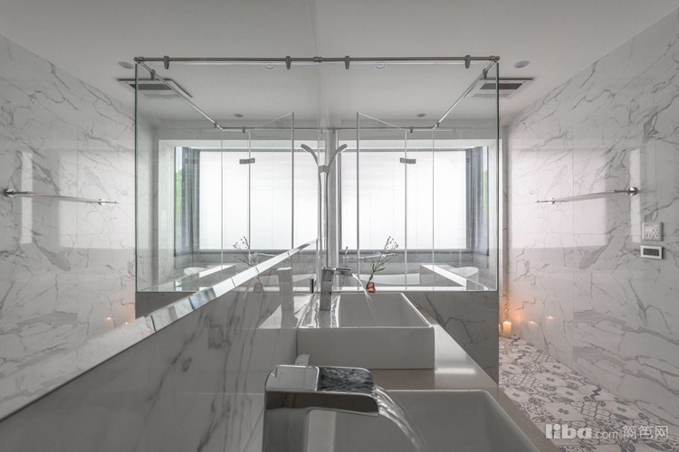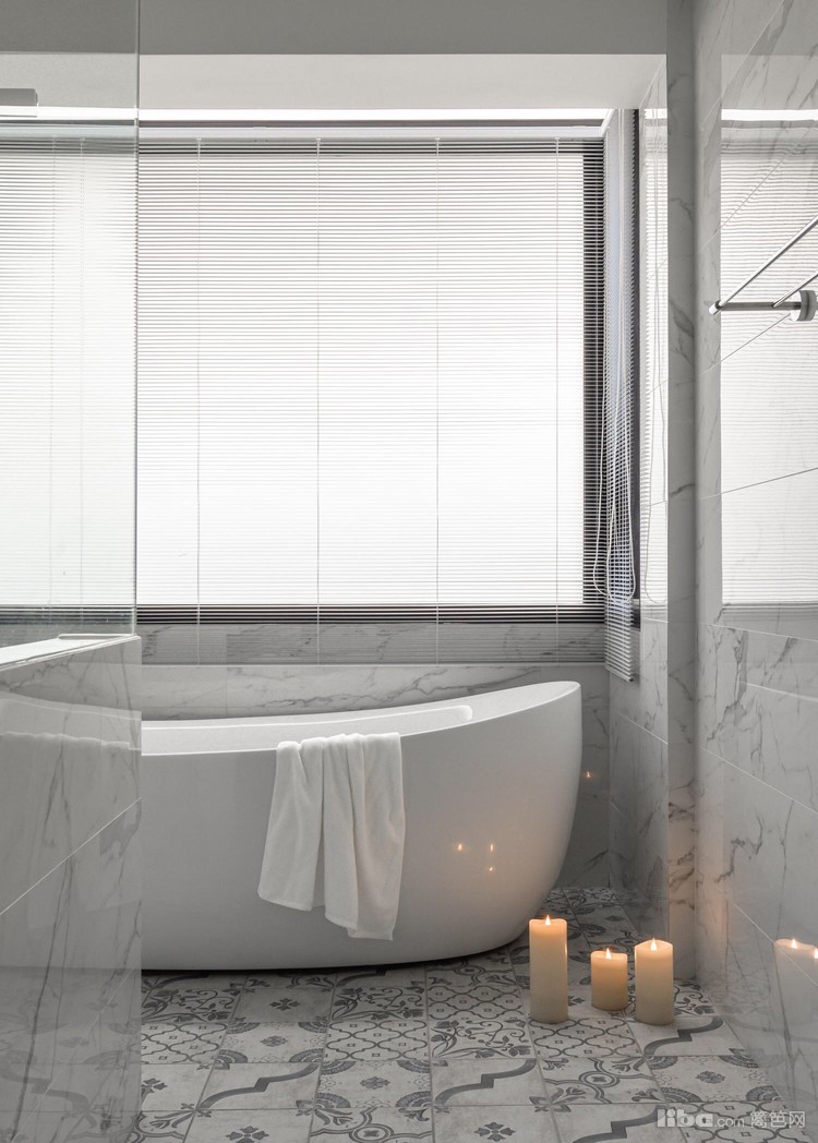 卫生间爵士白大理石瓷砖+独立落地浴缸+无敌光线百叶窗,简直是颜配!