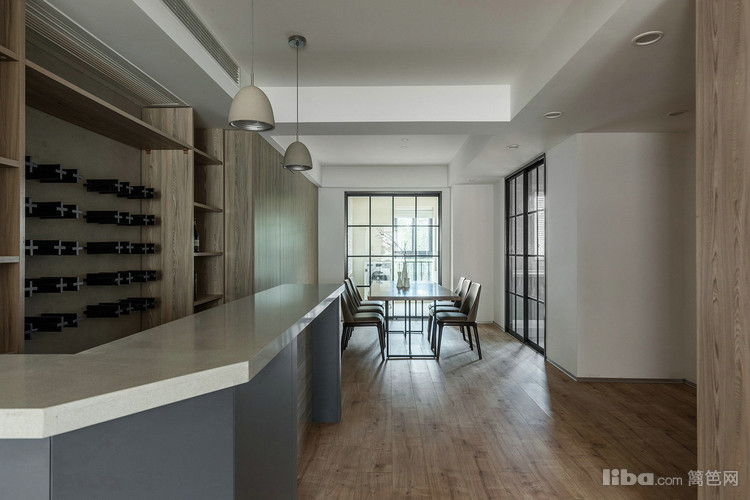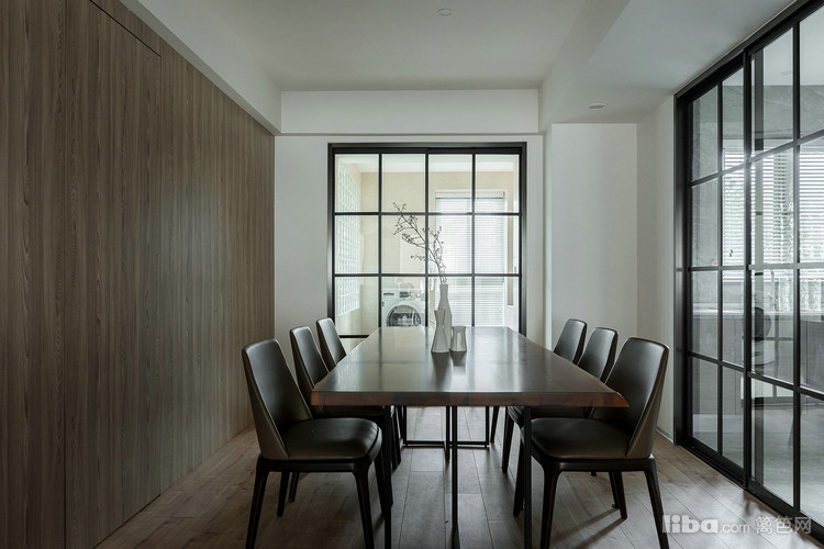餐厅区域,四扇玻璃推拉门将生活阳台和厨房的光引入餐厅。