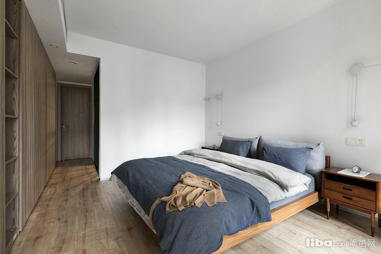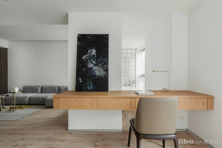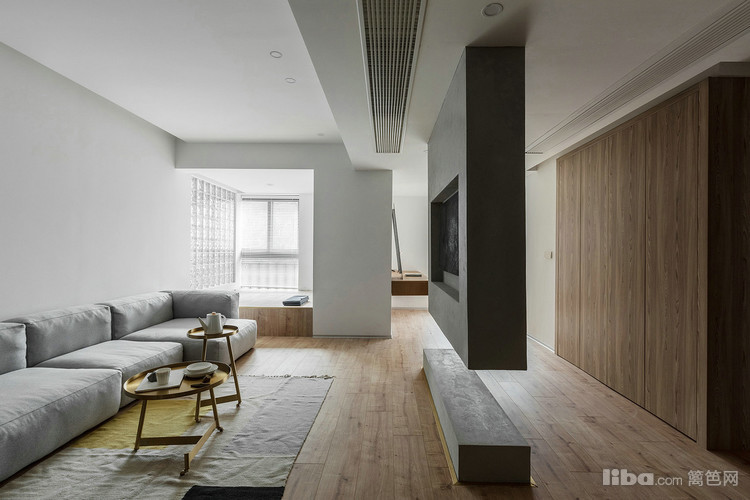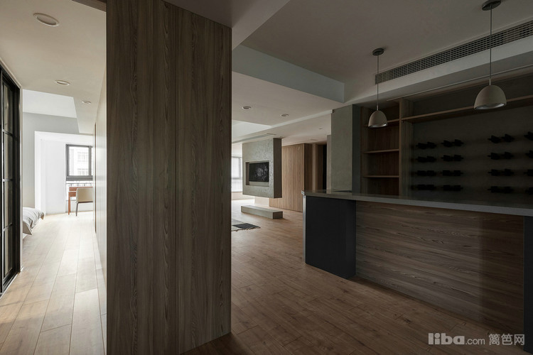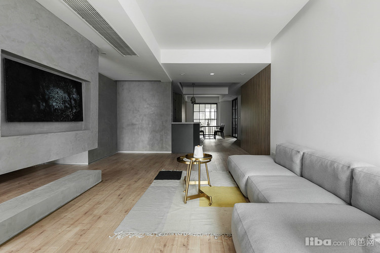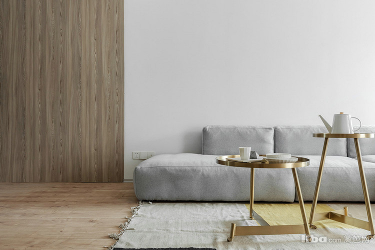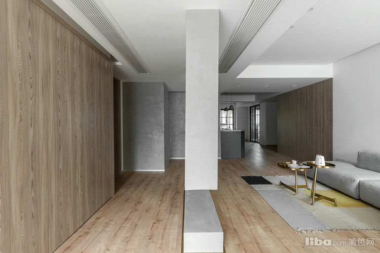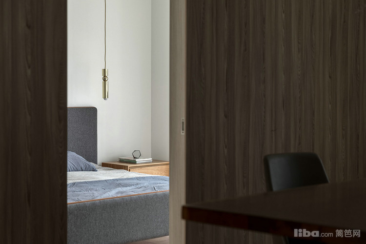 卧室采用隐形门,延伸的墙板分割了沙发背景墙,简单的材质对比丰富整个立面。