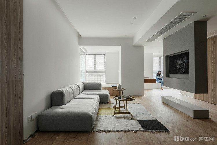 客厅整个开放区域我们选择了水泥漆、木饰面、白色乳胶漆作为主要材质穿插使用,使得联系与独立的主题延续。