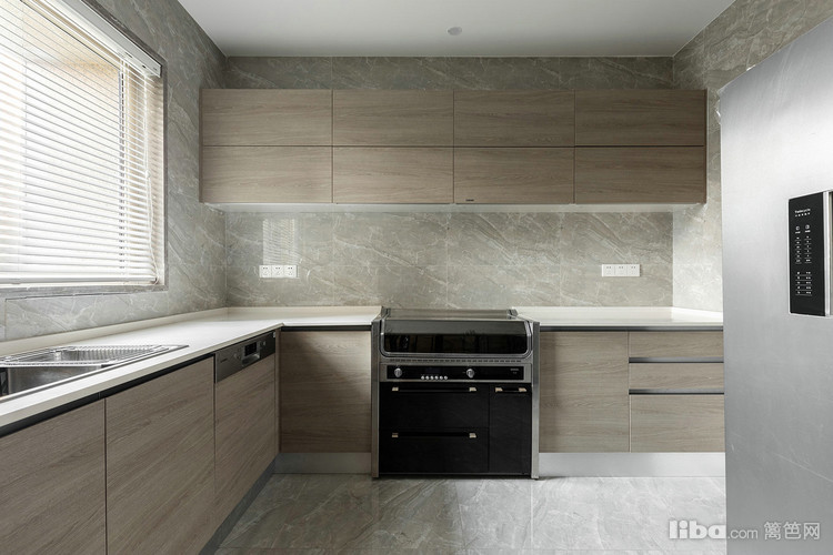 厨房使用集成灶下吸式排烟,借橱柜内部的空间回到烟道。