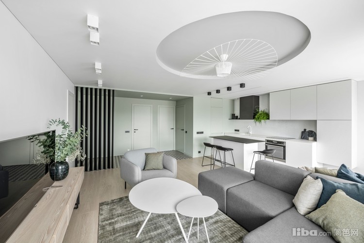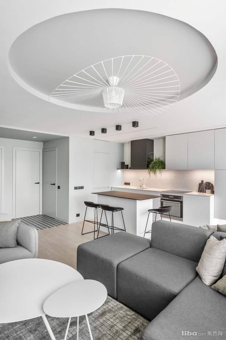 客厅区域,进入空间第一眼,夸张的吊顶圆设计,搭配夸张的吊灯,给整个空间增加一种独特的感受。