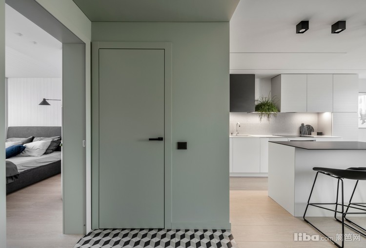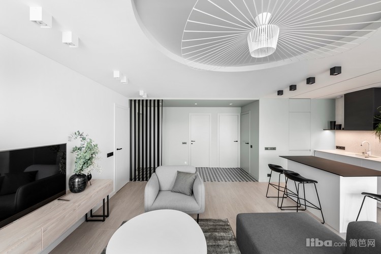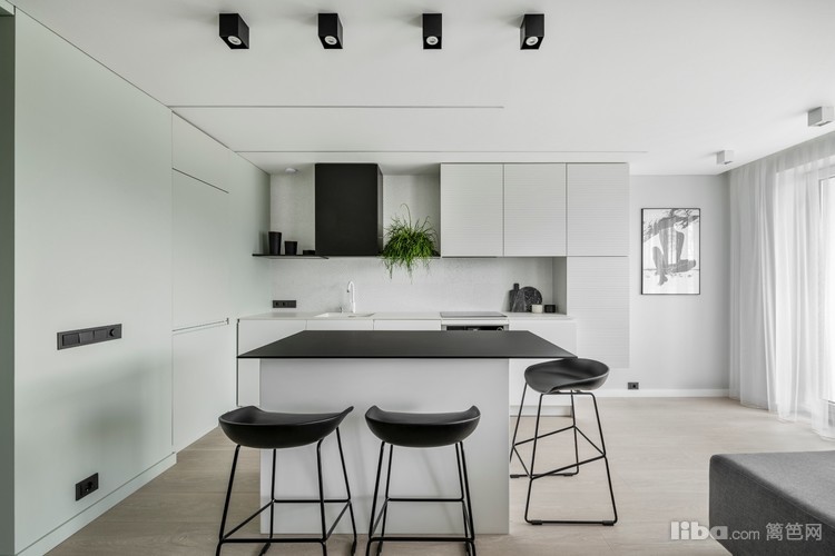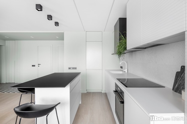 开放式的厨房,厨房大面积白色,结合黑色点缀,干净而有质感。