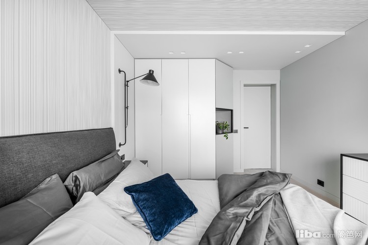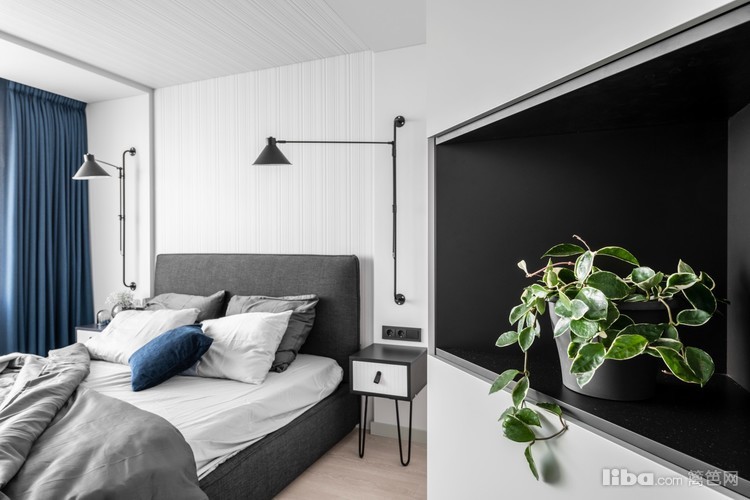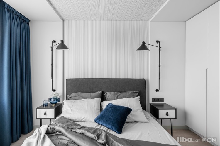卧室的蓝色窗帘,蓝色抱枕,提升了空间的贵气。