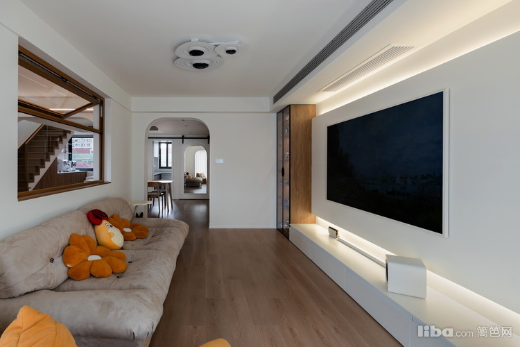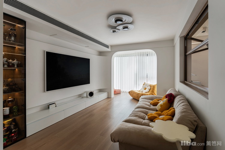 客厅中,以奶油色为基底,整个空间的气息都是都市、跳跃、摩登的,强调自由轻松的流动空间,不同材质、色彩间的混搭,家居的摆放亦有活泼的社交气氛。