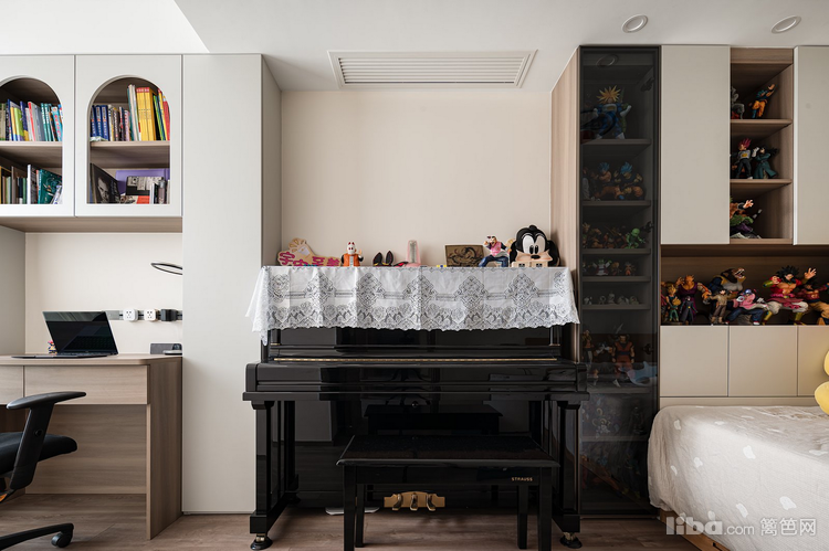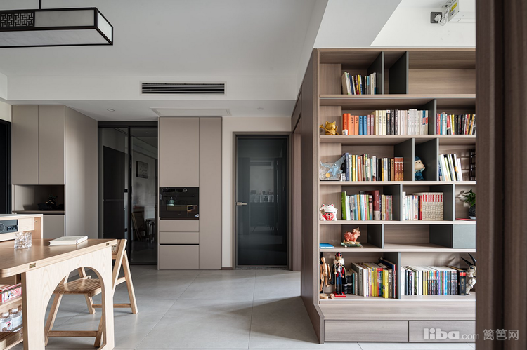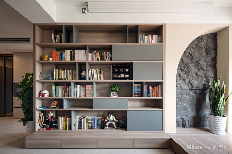 客厅背景墙改成一整面书架,顶天立地的设计,充分利用储物空间