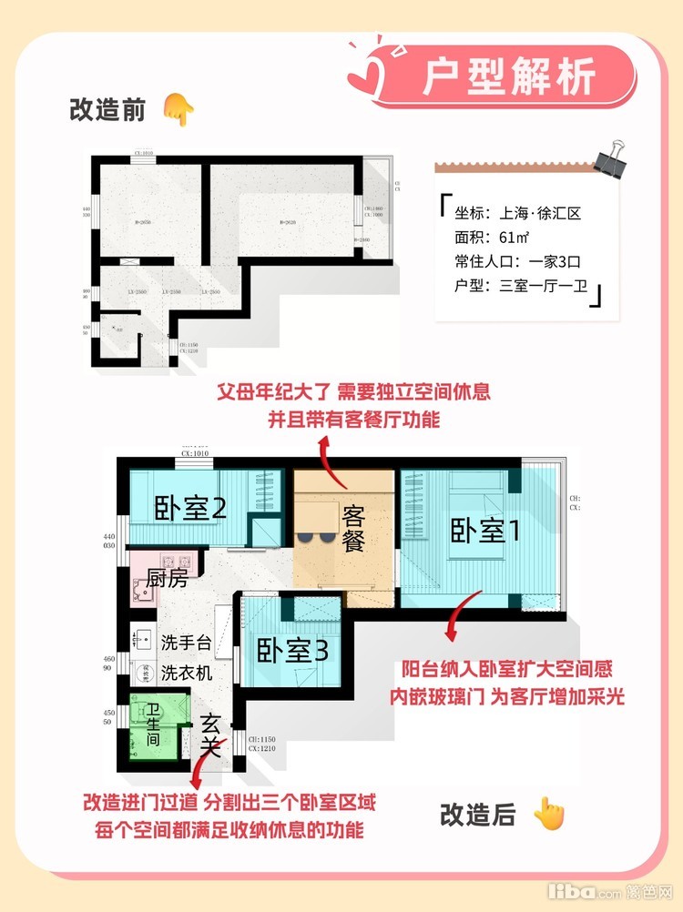 "手枪型" * 61㎡三室 小户型也能有三房独立休息空间