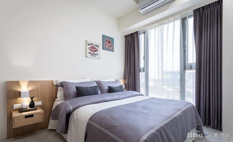 卧室。卧室是男主人选的,超大的落地窗给人以明亮的感觉。