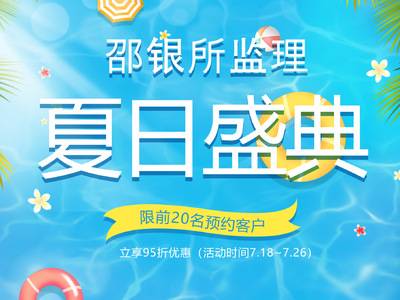 邵银所监理夏季优惠活动,前20名预约客户享95折全程监理服务优惠。活动时间:2023.7.18~2023.7.26