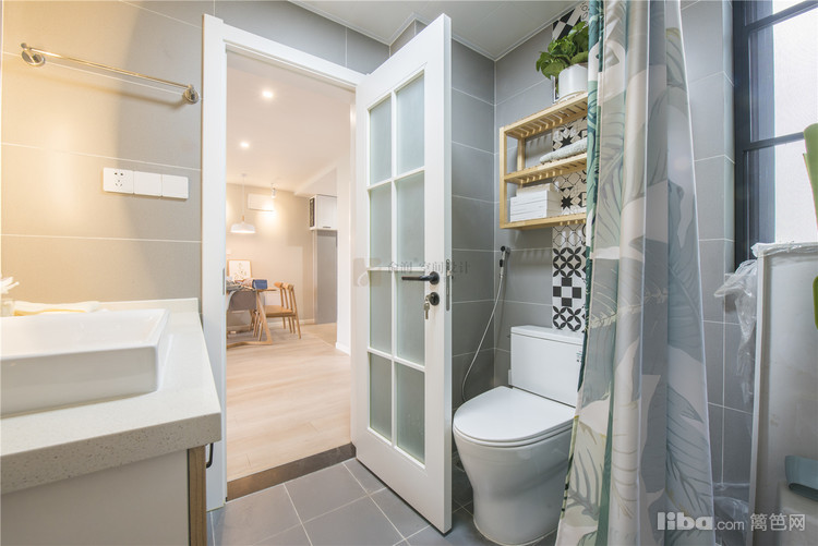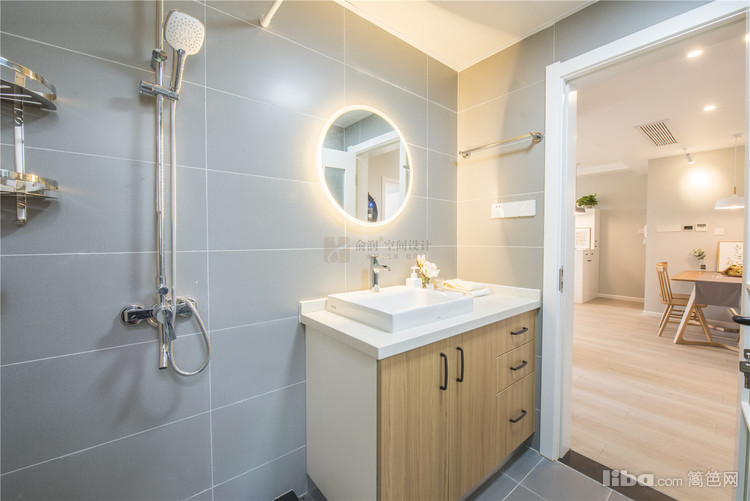06_卫生间 卫生间——灰色的墙地砖,搭配原木色的台盆柜,柔和的暖光让空间多了几分轻松的气息。