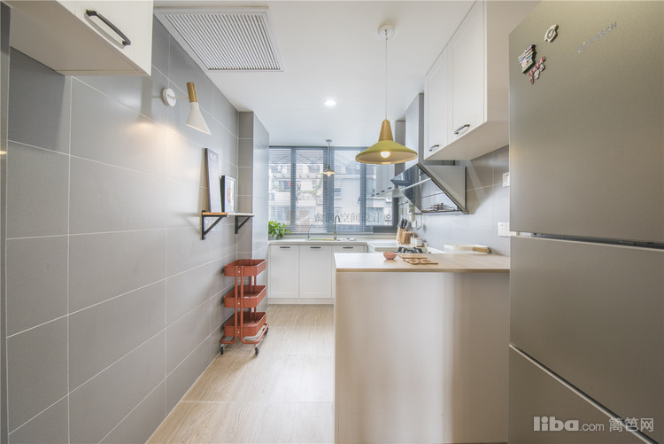 暖灰色的墙砖,亮白色橱柜,原木色木纹地砖,银灰色双开门冰箱,丰富了色彩上的层次感。